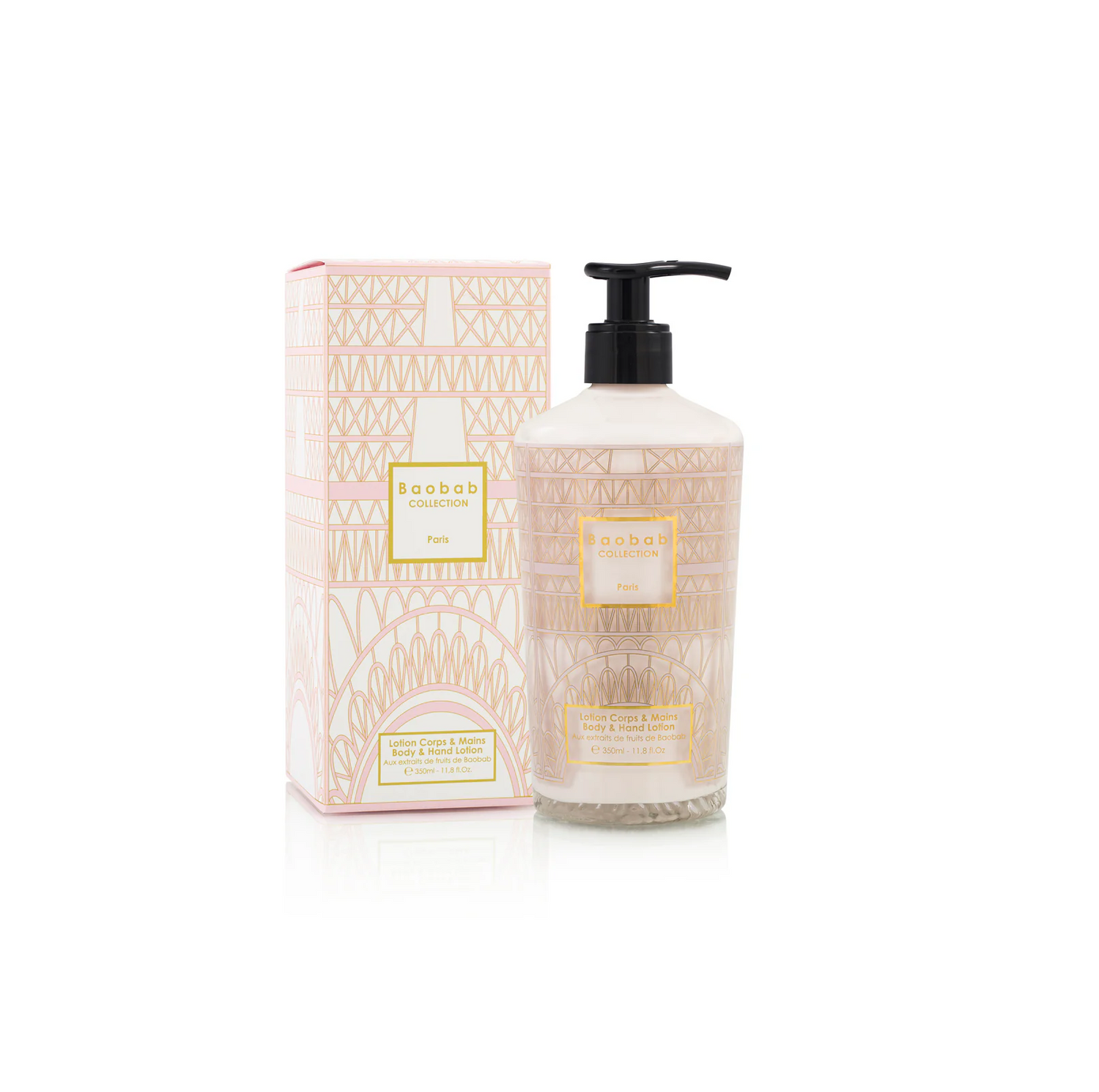 Experience the essence of Paris with the Baobab - Hand Lotion - Paris, beautifully adorned with a gold silk-screened print inspired by the iconic Eiffel Tower. This luxurious hand and body lotion, housed in a transparent glass bottle that showcases its delicate pale pink hue, not only serves as a stunning decorative piece for your bathroom but also provides exceptional hydration. Its lightweight, non-greasy formula absorbs quickly, leaving your skin feeling soft and moisturized without any sticky residue. Infused with a floral scent that evokes the charm of a spring stroll in Auteuil, the lotion features notes of Glycine, Mimosa, and Linden, enveloping you in a comforting fragrance. Enriched with ethically sourced Baobab oil and fruit extract, known for their powerful moisturizing properties, this lotion is perfect for daily use, especially after your morning shower. Simply massage it into your skin to enjoy a moment of pure softness and a lingering scent that transports you to the blooming streets of Paris.