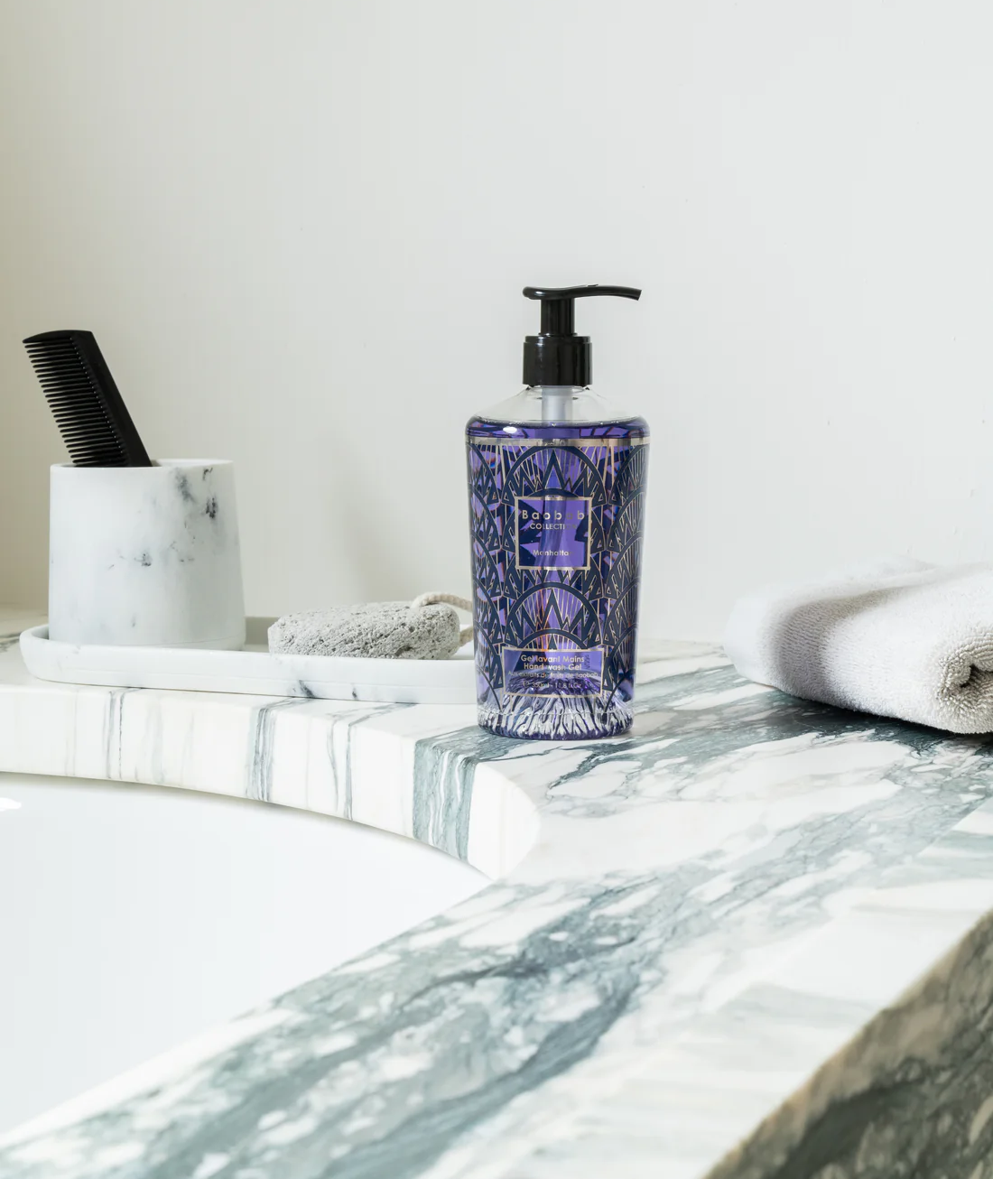 Experience the luxurious touch of the Baobab - Hand Wash Gel - Manhattan, a stunning decorative piece for your bathroom. Housed in a beautifully designed glass bottle adorned with a platinum and navy blue silk-screened print of the iconic Chrysler building, this hand wash not only cleanses but also enhances your space. The deep blue gel, visible through the elegant glass, adds a sophisticated flair while its soft, moisturizing texture pampers your hands. Infused with a unique fragrance of cypress, lavender, and papyrus, each lather releases a refreshing scent reminiscent of a spring stroll through Manhattan, leaving a delightful aroma that lingers for about 10 minutes. Ethically sourced Baobab fruit, six times more concentrated than other fruit ingredients, ensures your hands are nourished with every wash. Use the Baobab - Hand Wash Gel - Manhattan as often as you like for a cleansing experience that is both comforting and invigorating.