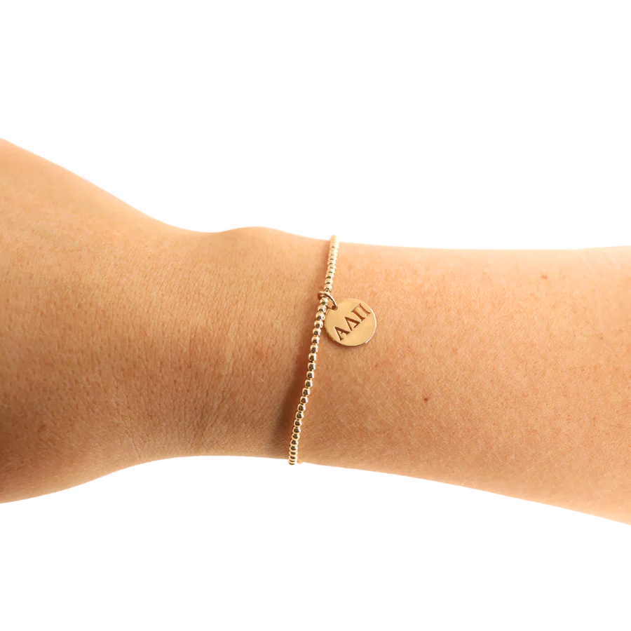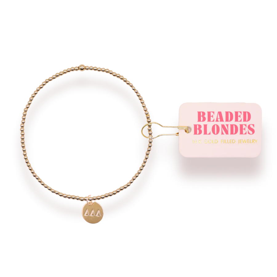 Discover the perfect blend of style and individuality with the Beaded Blondes - Bracelet - Gold - Sorority Charm . This exquisite bracelet features a unique mix of 2MM 4K gold-filled beads with sorority charm. Crafted with 14K gold-filled materials and elastic string, this bracelet is not only stunning but also waterproof, workout proof, and tarnish proof, making it ideal for everyday wear. Handstrung in College Station, Texas, and sourced in the US, it comes in Standard 6.75 inch for the average wrist. Choose from a variety of sorority charms including ΑΔΠ, ΔΔΔ, ΚΔ, ΦΜ, ΧΩ, and ΖΤΑ to showcase your pride. The Beaded Blondes - Bracelet - Gold - Sorority Charm stackable beaded bracelet is a must-have accessory that combines durability with a personal touch.