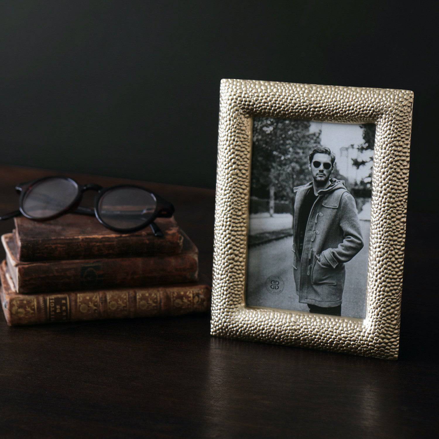 The shimmering FRAME Sierra Modern Georgina 4x6 Frame (Gold) features a modern and exciting proprietary metallic gold-tone finish, and a texture reminiscent of shagreen. Designed to display a 4x6 photo (vertically or horizontally), the luxe frame looks amazing on a desk, mantle, or table. The delightfully decorative piece adds a modern new edge to Beatriz Ball’s award-winning designs. Great choice for easy gifting. Beatriz Ball’s intensely handmade products use eco-friendly and sustainable materials and are crafted by artisans who trace a heritage of metalworking for generations. Made of a top quality, easy-care, aluminum alloy. Tarnish-free!