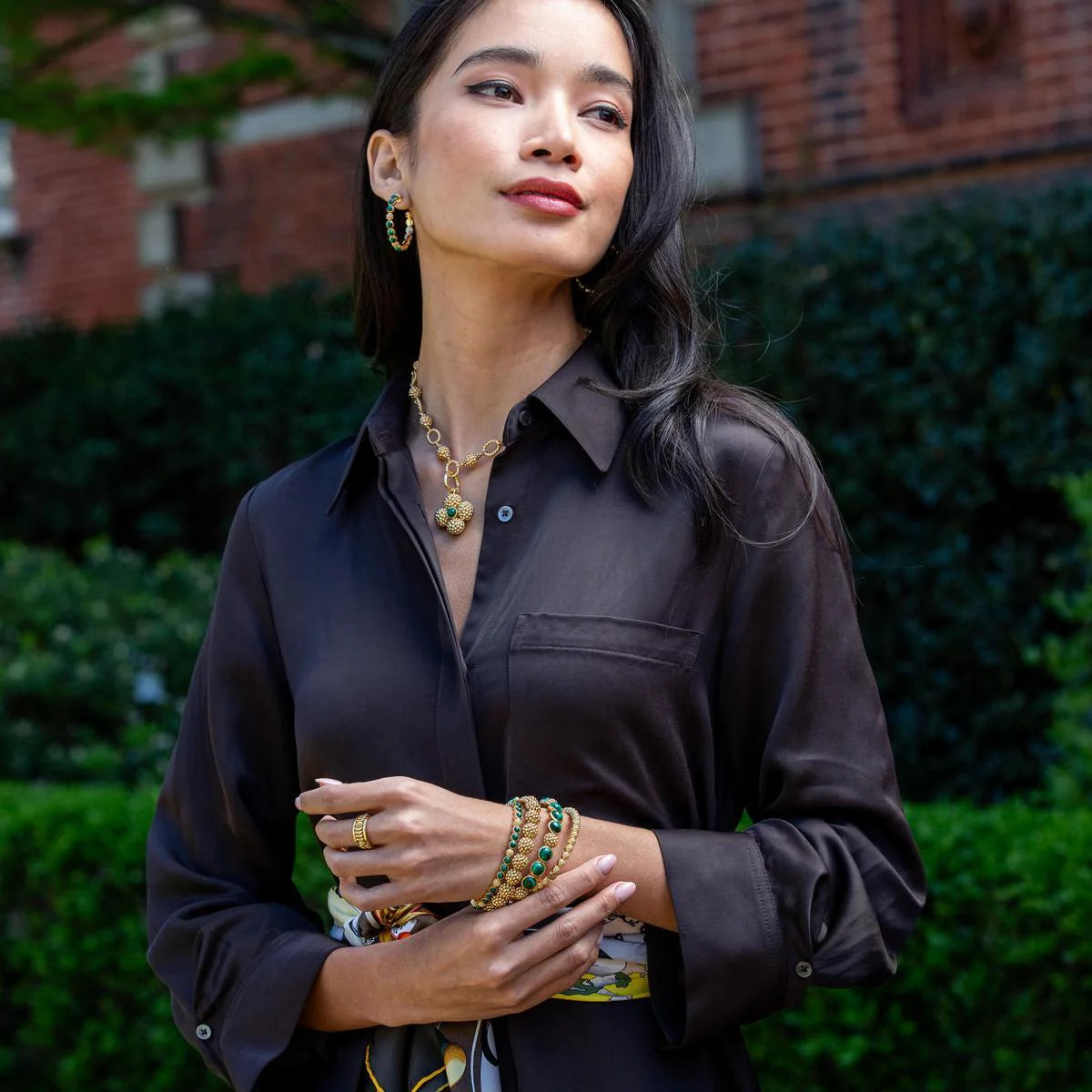Discover the exquisite charm of the Capucine de Wulf - Bracelet - Berry Gem Petite Hinged Bangle - Malachite, a stunning piece that beautifully combines elegance and artistry. Crafted from 18K gold plated brass, this refined bangle features trios of vibrant green malachite, harmoniously accented by delicate golden berries. Measuring 2.4 inches in length and 2.2 inches in width, this bangle is the perfect accessory to enhance any outfit, whether you're leading a meeting, hosting an elegant dinner party, or jet-setting to glamorous destinations like Monaco. Each piece is meticulously handmade in India, ensuring that every bangle carries its own unique character and the soulful imperfections of the artisan's touch. To maintain its beauty, avoid contact with water, lotions, perfumes, and other chemicals. The Capucine de Wulf - Bracelet - Berry Gem Petite Hinged Bangle - Malachite is not just a piece of jewelry; it’s a statement of sophistication and individuality.