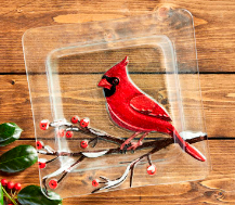 This beautiful hand painted Cardinal Glass Serving Plate showcases a stunning cardinal perched on a branch with berries. Measuring 9" x 9", this unique plate is perfect for serving appetizers, desserts, or even as a decorative piece. The intricate details and vibrant colors make it a standout addition to any table setting or home decor. Perfect for bird lovers or anyone who appreciates handcrafted art, this Cardinal Glass Serving Plate is sure to be a conversation starter at any gathering.
