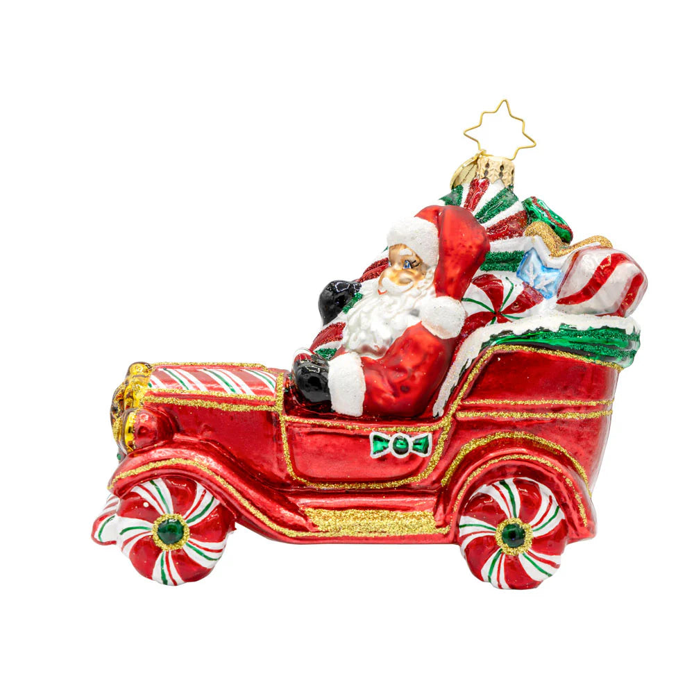 Get ready for a delightful twist on holiday traditions with the Christopher Radko - Ornament - Sweet Ride Cruiser. This charming ornament features Santa trading in his classic sleigh for a whimsical candy-themed car, perfect for delivering sweet surprises this festive season. Measuring 4.25 inches in height, 5.25 inches in length, and 2.5 inches in width, this unique piece adds a playful touch to your holiday decor. Celebrate the joy of Christmas with this enchanting ornament that captures the spirit of the season. The Christopher Radko - Ornament - Sweet Ride Cruiser is a must-have for collectors and holiday enthusiasts alike.