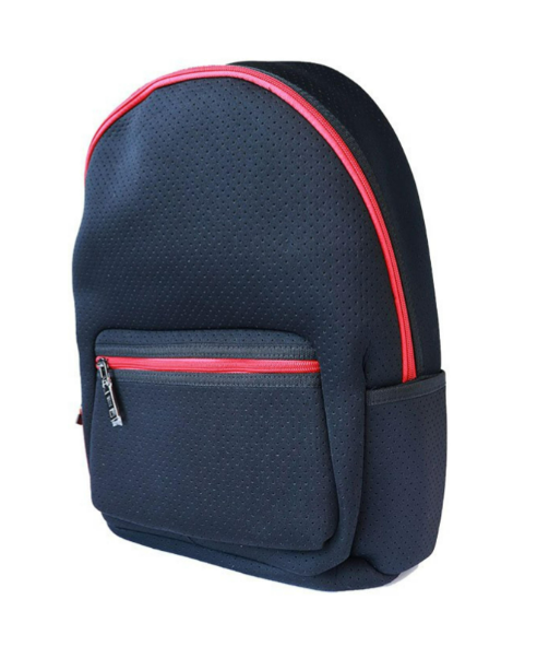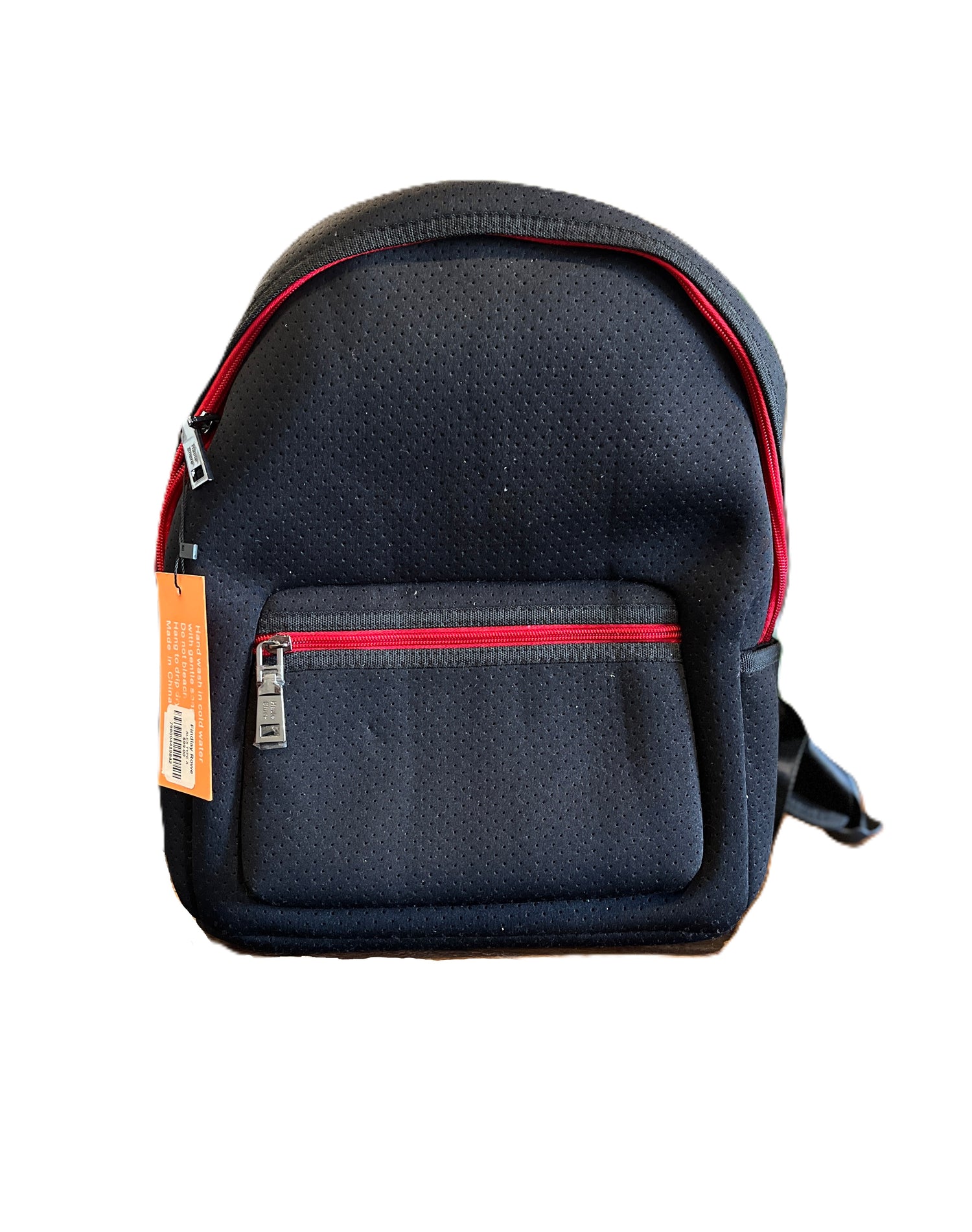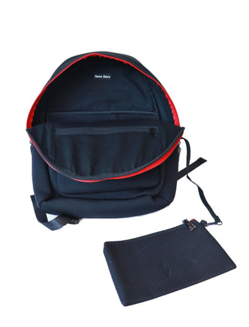 The Haute Shore - Alex backpack A- Black is the perfect companion for those on the go, featuring a durable neoprene body that combines style and functionality. This sleek black backpack is designed with a striking red zipper, offering an eye-catching contrast. It includes an interior detachable pouch for added convenience, along with multiple pockets, including an outer zipper pocket and interior slip and zipper pockets, ensuring ample storage for your essentials. With dimensions of 11.5 L X 5 W X 17 H inches, this backpack is both compact and spacious. For maintenance, simply hand wash in cold water, avoid bleach, and hang to drip dry. The Haute Shore - Alex backpack A- Black is an ideal choice for anyone seeking a versatile and fashionable backpack.