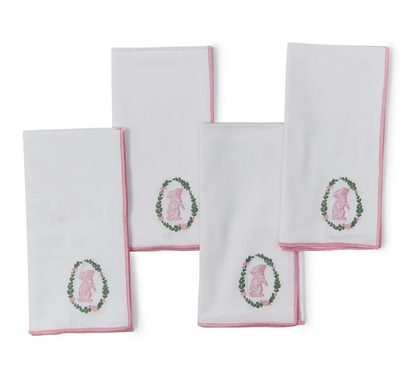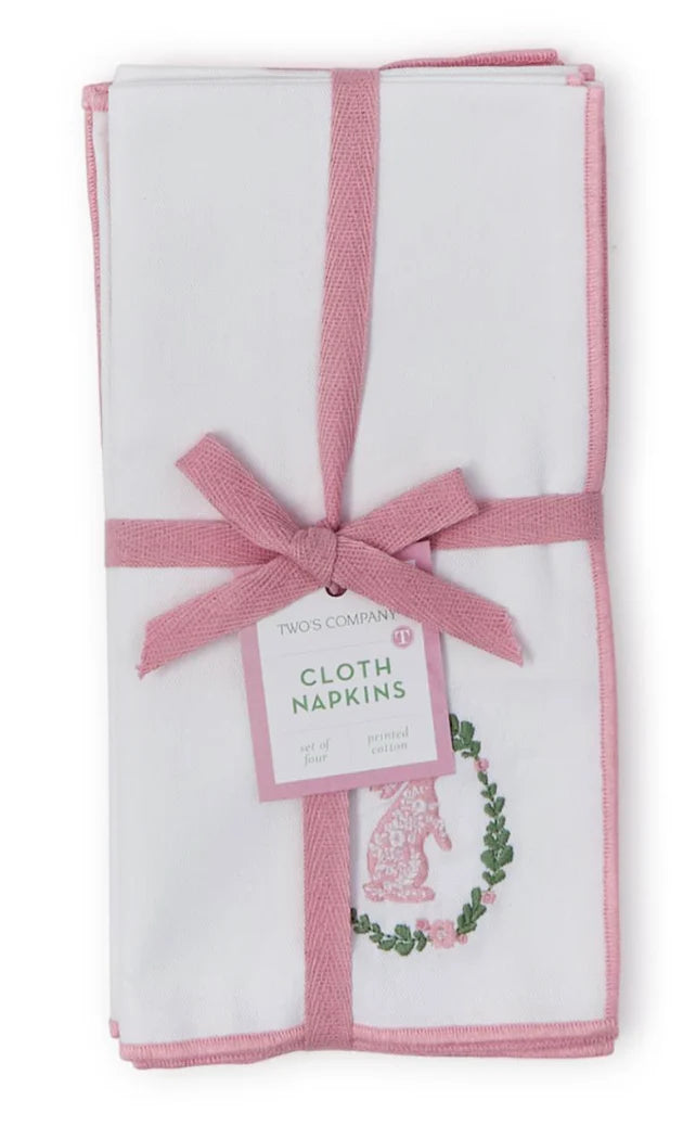 Enhance your dining experience with our Cloth Napkin - Spring Soiree, a delightful set of four 20" square napkins crafted from thick, high-quality cotton. Each napkin features an exquisite embroidered floral bunny design, complemented by a charming pink merrow-stitch trim, making them perfect for Easter hosting or any spring gathering. These napkins not only add a whimsical touch to your table setting but also pair beautifully with our matching table runner. Each set is elegantly tied with a ribbon bow, ensuring they make a lovely presentation. Transform your dining table with the Cloth Napkin - Spring Soiree and enjoy the warmth of spring in your home.