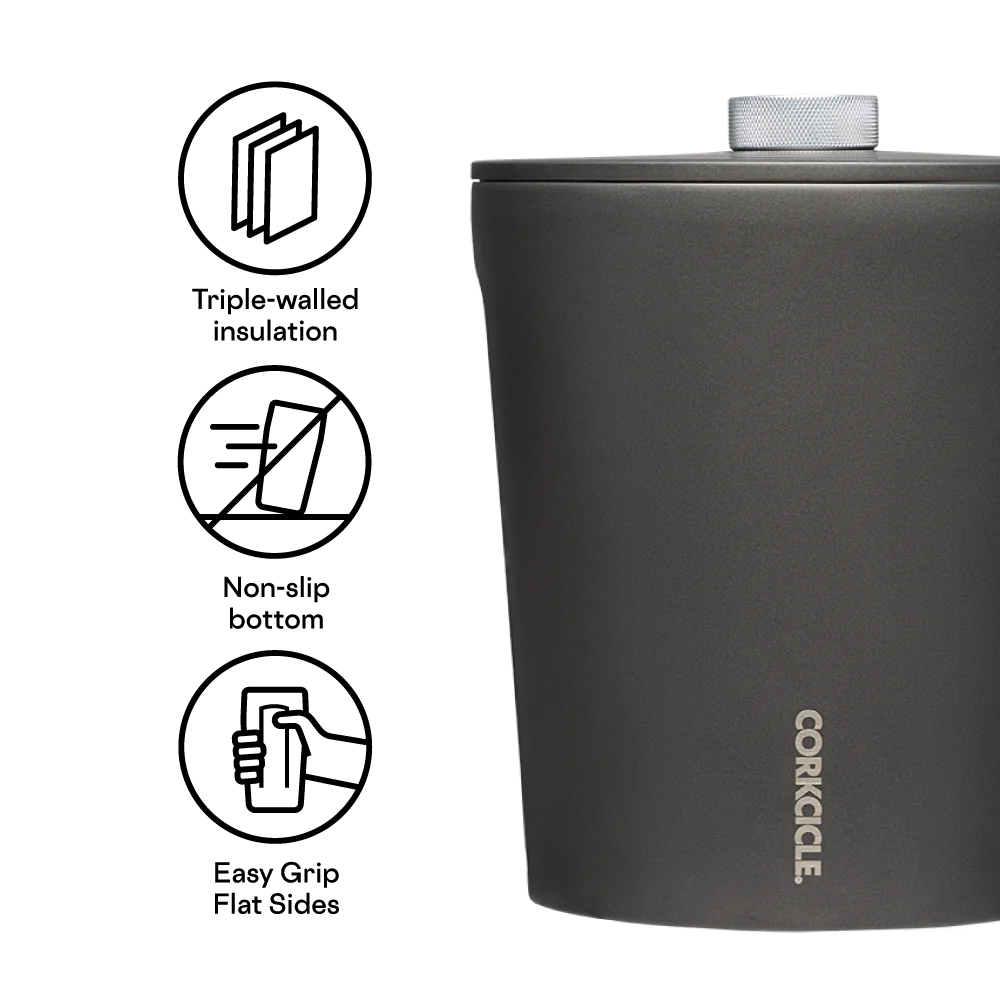 Corkcicle's ice bucket is the ice storage device that’s sleek, stainless, and super insulated to keep beverages/ice cold for up to 48 hours. The perfect party ice bucket for all your gatherings. Slip in your favorite bottle of wine or pile the 100 oz ice bucket high with ice for serving. Designed with our signature flat sides, non-slip bottom, and triple-walled insulation, it’s the savvy, ergonomic solution for all your ice woes.
