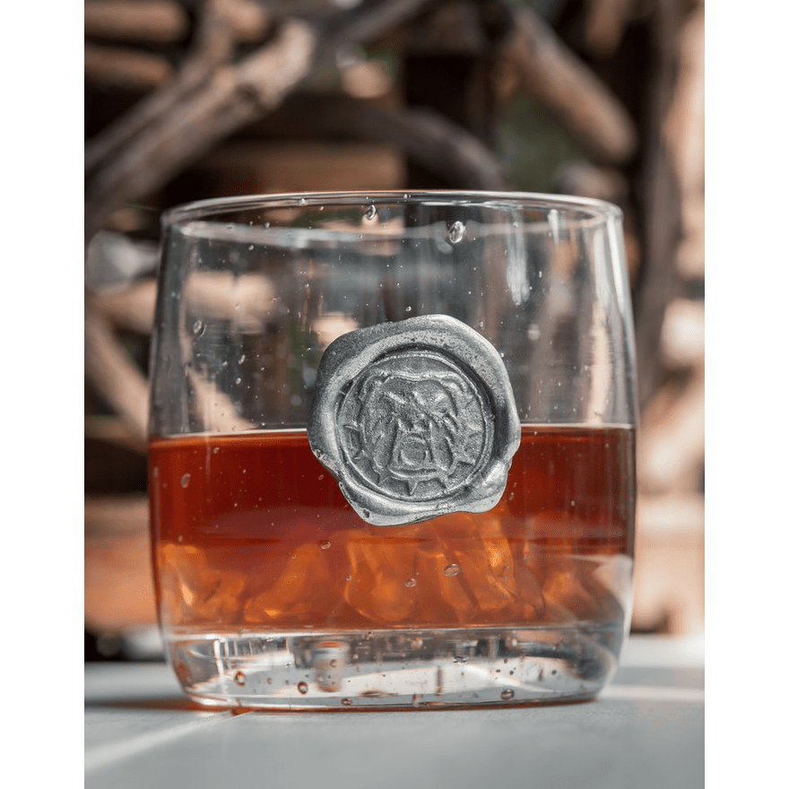 Double Old Fashioned glass adorned with hand cast pewter bulldog stamp