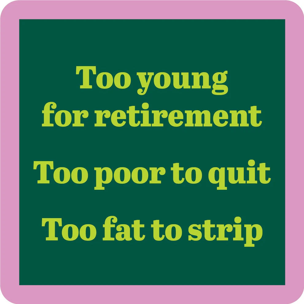 "Too young for retirement, Too poor to quit, Too fat to strip "