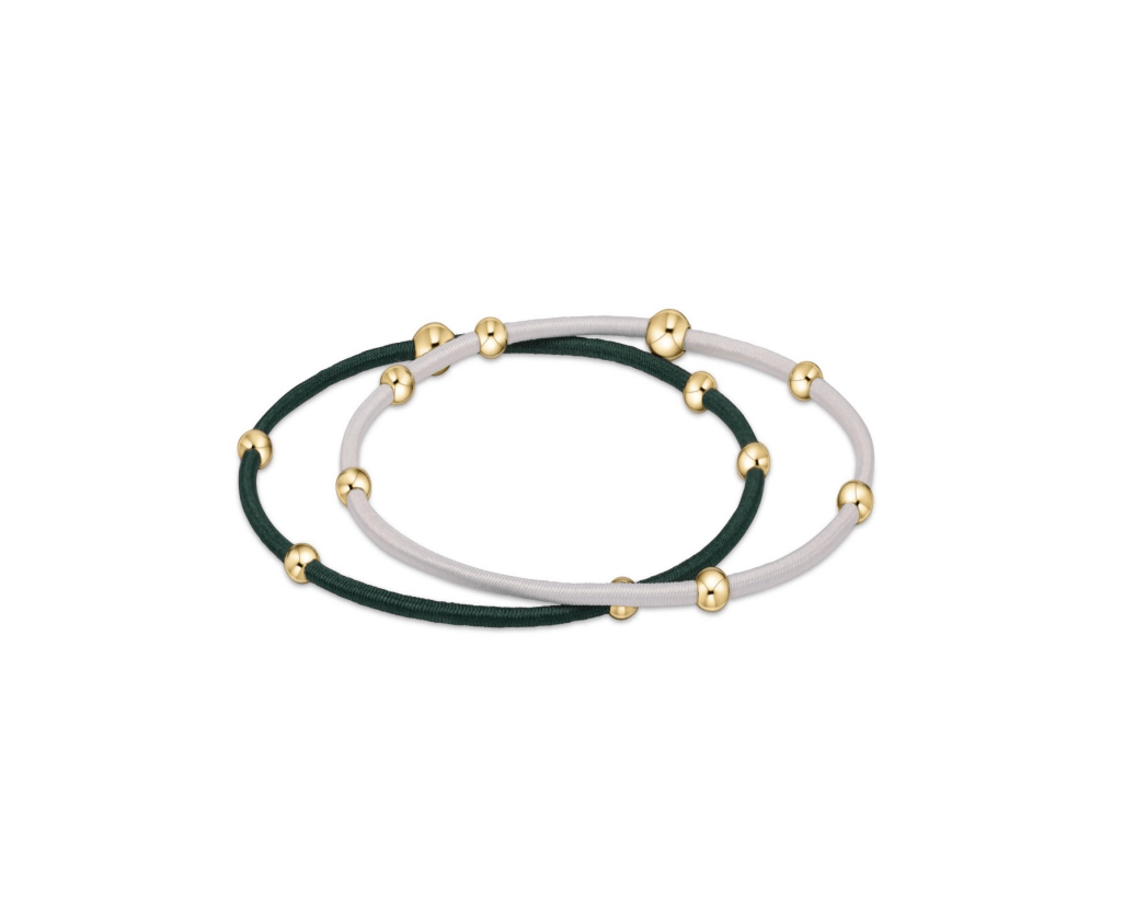 Enewton - essentials Gameday Hair Bracelet - Dark Green - White is crafted with 14kt gold-filled beads and 2mm Dark Green and White round elastic cords. This 2-pack Enewton - essentials Gameday Hair Bracelet - Dark Green - White measures 6.25 inches and can be worn in your hair or on your wrist!
