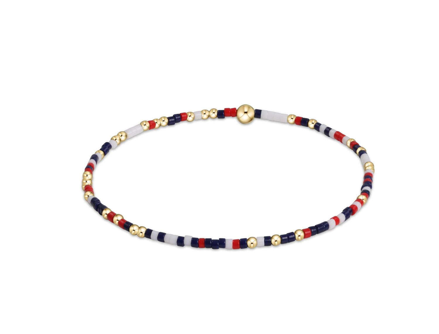 Get ready for the Fourth of July with ourEnewton - Extends Hope Unwritten Bracelet - Firecracker, designed with a delightful mix of 2mm red white and blue seed beads and 2mm 14k gold-filled beads. This hand-beaded bracelet is crafted on high-performance elastic, providing a comfortable stretch that allows for easy wear. Enjoy worry-free use as you can sleep, shower, and sweat without concern. Measuring 7.25 inches, this bracelet stacks beautifully with all your favorite accessories, making it a versatile addition to your collection. Embrace the spirit of spring and summer with the Enewton - Extends Hope Unwritten Bracelet - Firecracker