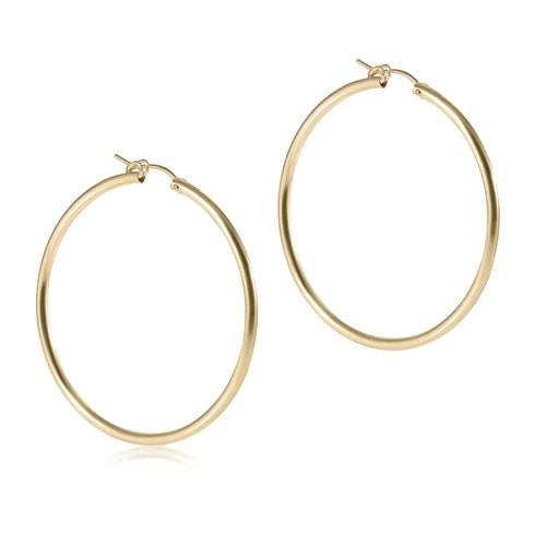 I'm not old, I'm classic. Introducing the Enewton - Round Gold Hoop - Smooth - 2 Inch. These 14kt gold-filled smooth hoops, featuring a secure notch clasp, bring timeless elegance to any look. Available in a 2-inch diameter, they are lightweight and designed for worry-free wear, allowing you to sleep, shower, and sweat in them.