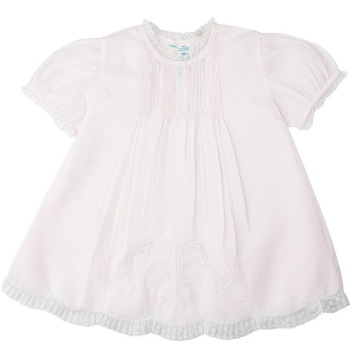 This stunning slip dress is perfect for your little girl! It is designed with a vintage touch, available in soft white and pink colors. The dress is adorned with delicate fluted lace trim at the neck, cuffs, and hem. The front showcases elegant lace inlays and pintucks on top, along with intricate floral embroidery at the bottom. This dress is truly breathtaking and embodies a traditional, heirloom style that will be cherished for generations to come.