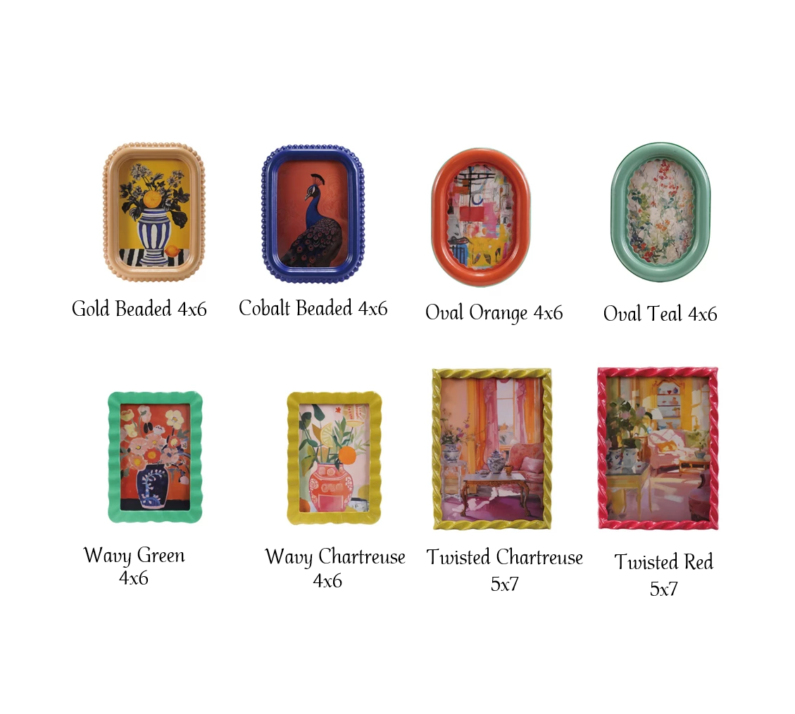 Frame - 4x6 or 5x7 - Twisted Wavy and Ruffled is a stunning addition to your home decor, designed to showcase your cherished memories in style. This 7-inch tall photo frame, crafted from durable resin and MDF, features a unique twisted bobbin and ruffled design that adds a touch of whimsy to any space. Available in a delightful array of multi colors and eight distinct styles, it accommodates both 4-inch by 6-inch and 5-inch by 7-inch photos, making it versatile for your favorite snapshots. Whether you choose to hang it on the wall or display it on a tabletop, this frame is sure to enhance your living area with its charming aesthetic. Frame - 4x6 or 5x7 - Twisted Wavy and Ruffled is not just a frame; it's a statement piece that brings your memories to life.