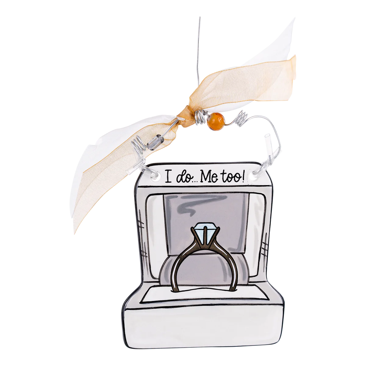 Celebrate love and cherished memories with the Glory Haus - Ornament - I Do Ring Box Flat, a delightful flat ornament shaped like a ring box featuring the heartfelt phrase "I do... me too!" This charming piece is an ideal wedding gift, especially when personalized with the couple's names and wedding date, adding a sentimental touch to any occasion. Measuring 3.5 inch x 4 inch, this hand-painted ceramic ornament is designed to hang beautifully on your tree, complete with a wire hanger adorned with beads and ribbons. Perfect for engagements, weddings, anniversaries, Valentine's Day, and Christmas, the Glory Haus - Ornament - I Do Ring Box Flat is a timeless addition to your holiday decor and a wonderful keepsake for years to come. Each year brings new designs, making these ornaments perfect for gifting or collecting.