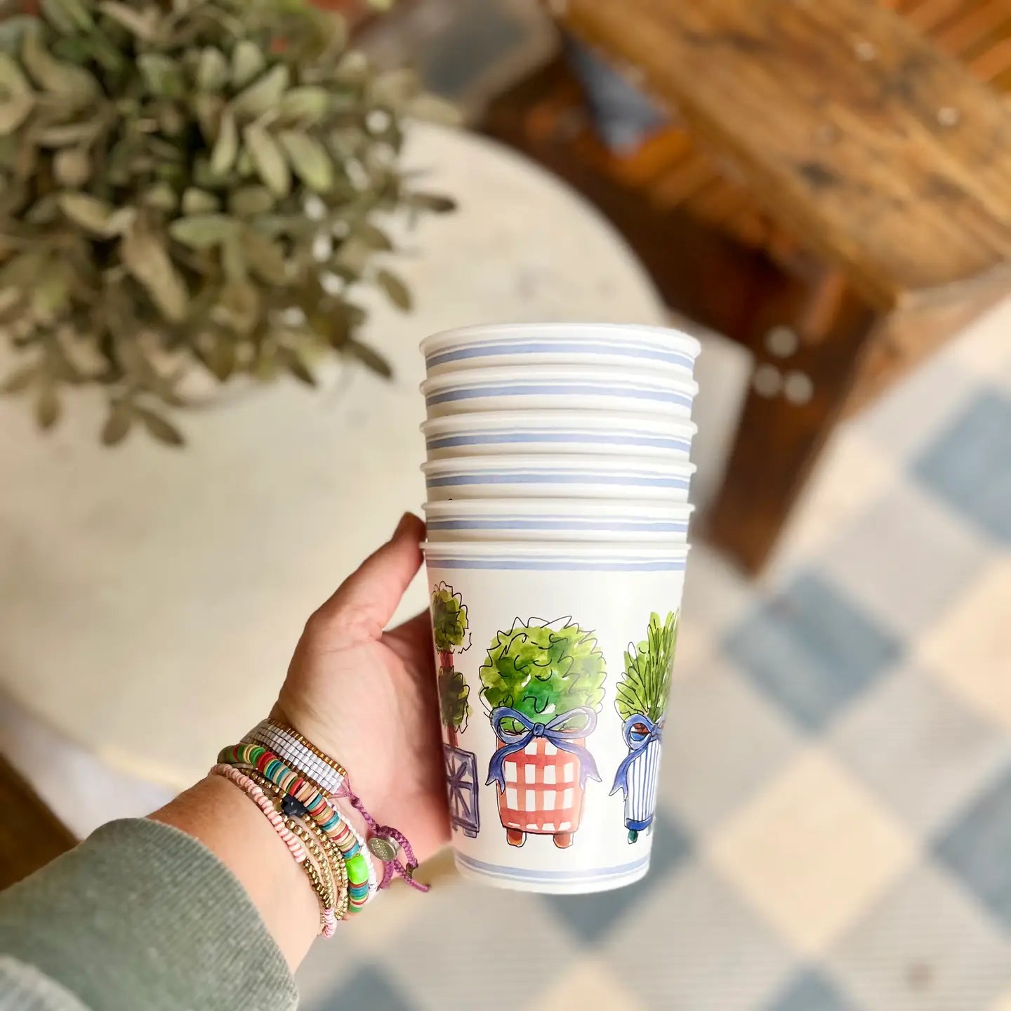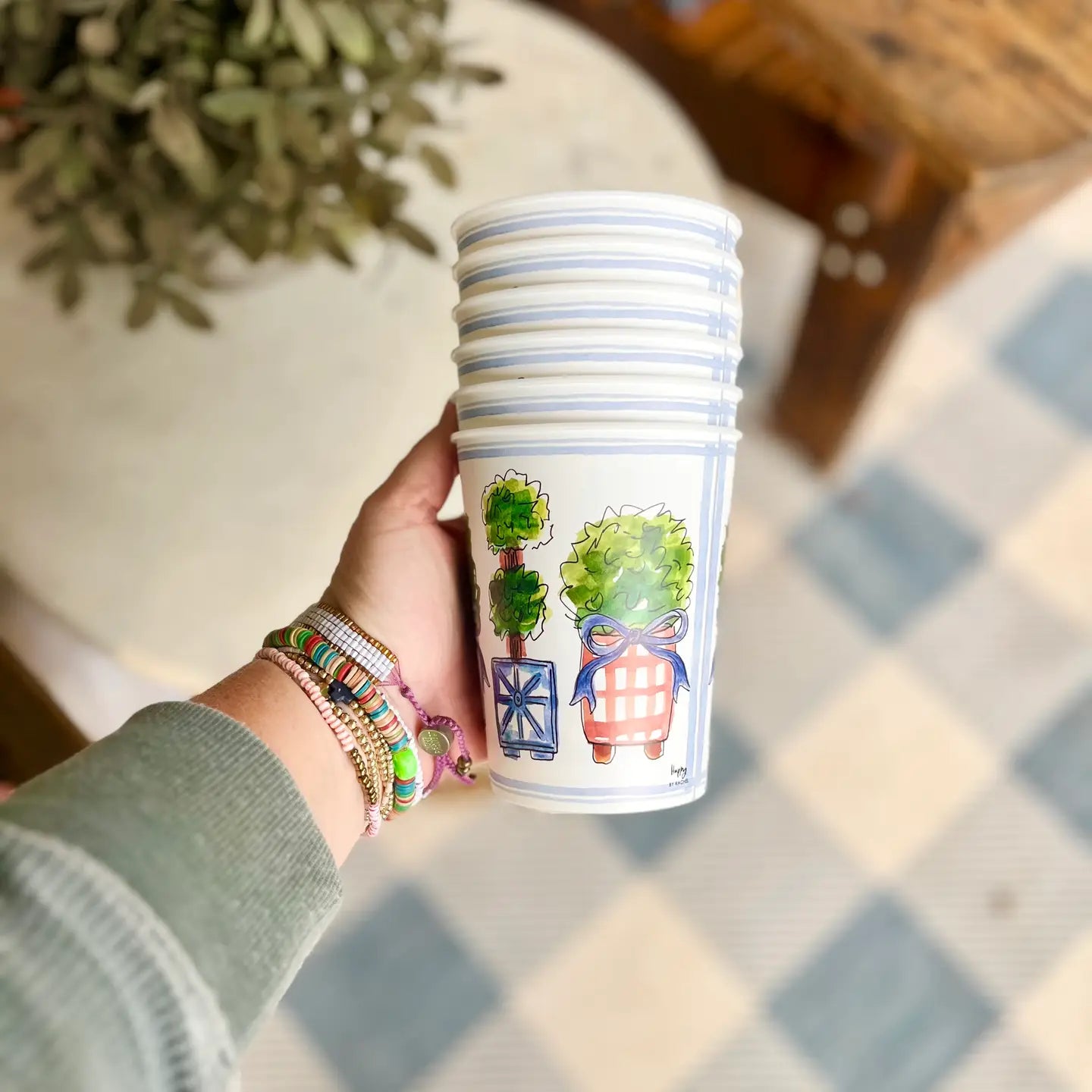Happy by Rachel - Reusable Party Cups - Plants and Bows offer a delightful way to enjoy your favorite beverages while celebrating Springtime. Featuring hand-drawn original artwork that highlights whimsical potted plants and topiaries, beautifully accented with blue hand-drawn bows, adding a touch of elegance to your culinary space. These cups serve as both functional drinkware and collectible memorabilia. They are perfect for parties, gatherings, or everyday use. Made from durable materials, these cups are reusable and dishwasher safe, ensuring they can be enjoyed for years to come. Elevate your drinking experience with the Happy by Rachel - Reusable Party Cups - Plants and Bows, designed by Rachel Walker.