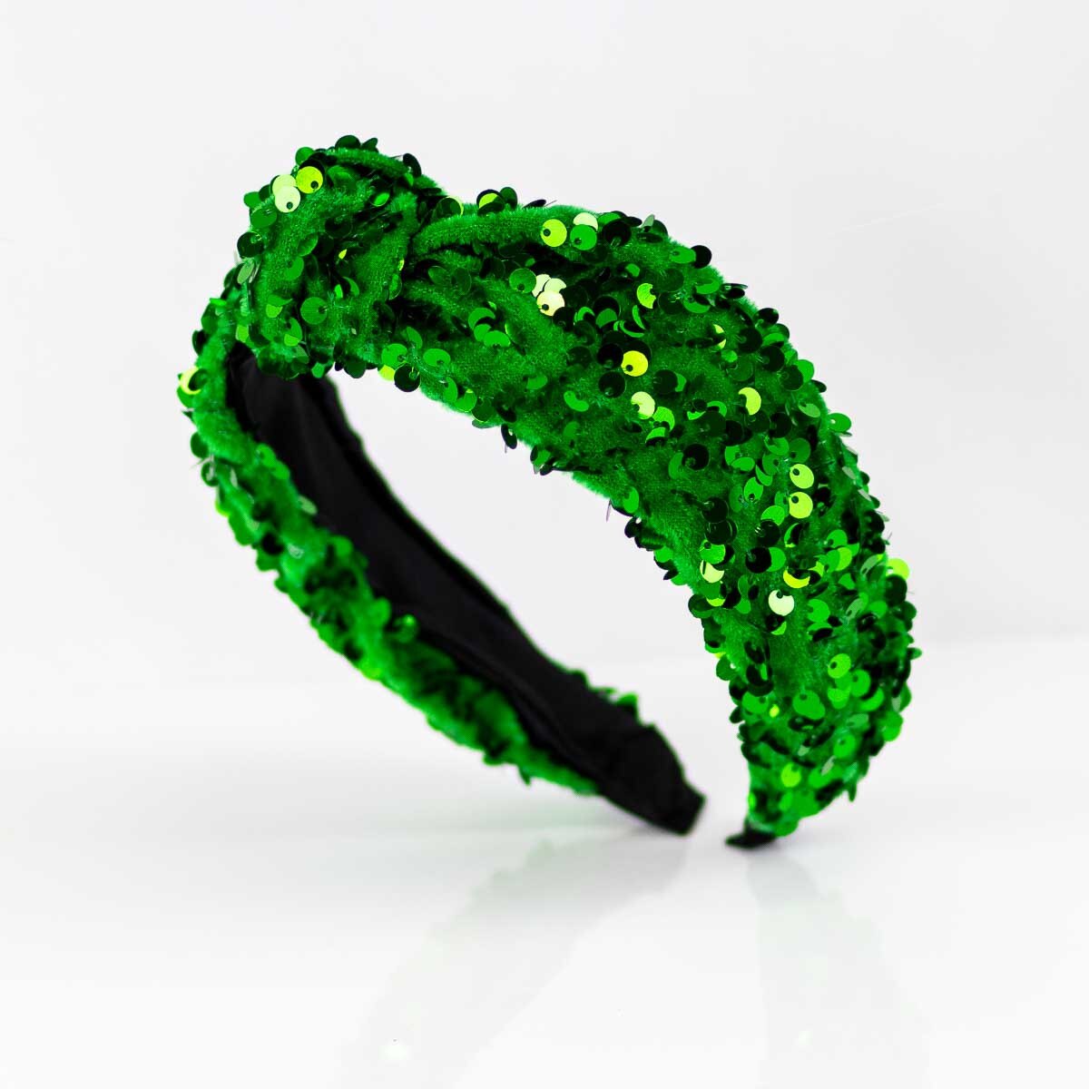 Enhance your style with our Headband - Sequin Knotted - Green, featuring a vibrant green base adorned with striking green sequins. This eye-catching accessory is crafted from durable polyester, ensuring a comfortable fit while adding a touch of glamour to any outfit. Perfect for parties or casual outings, the Headband - Sequin Knotted - Green is designed for easy maintenance with spot clean only care instructions. Complete your look with this delightful headband that effortlessly combines fun and fashion.