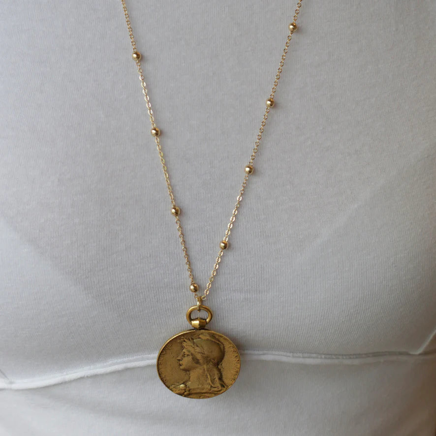 Discover the perfect blend of elegance and history with the InspireDesign - Necklace - Angel - Coin. This mid-length gold necklace, measuring 18 inches, is designed to be worn solo for a chic statement or layered with other pieces for a trendy jewelry stack. The artisan coin pendant, featuring the iconic Marie Antoinette, adds a touch of royal charm to any outfit. Whether you're dressing up for a special occasion or adding flair to your everyday look, the InspireDesign - Necklace - Angel - Coin is a versatile accessory that enhances your style effortlessly.