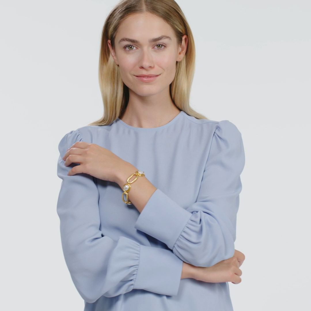 Discover the exquisite charm of the Julie Vos - Bracelet - Wave Stone - Pearl, a stunning piece that showcases a curvaceous design adorned with polished cabochons and oblong links that mimic the elegance of hand-stretched golden rings. Crafted with a luxurious 24K gold plate and imported glass, this bracelet offers an adjustable inner circumference of 7 to 7.8 inches, ensuring a perfect fit for any wrist. With a width of 0.7 inches, it closes securely with a stylish toggle, making it both fashionable and functional. The Julie Vos hallmark signifies its quality and craftsmanship, making the Julie Vos - Bracelet - Wave Stone - Pearl a must-have accessory for any jewelry collection.