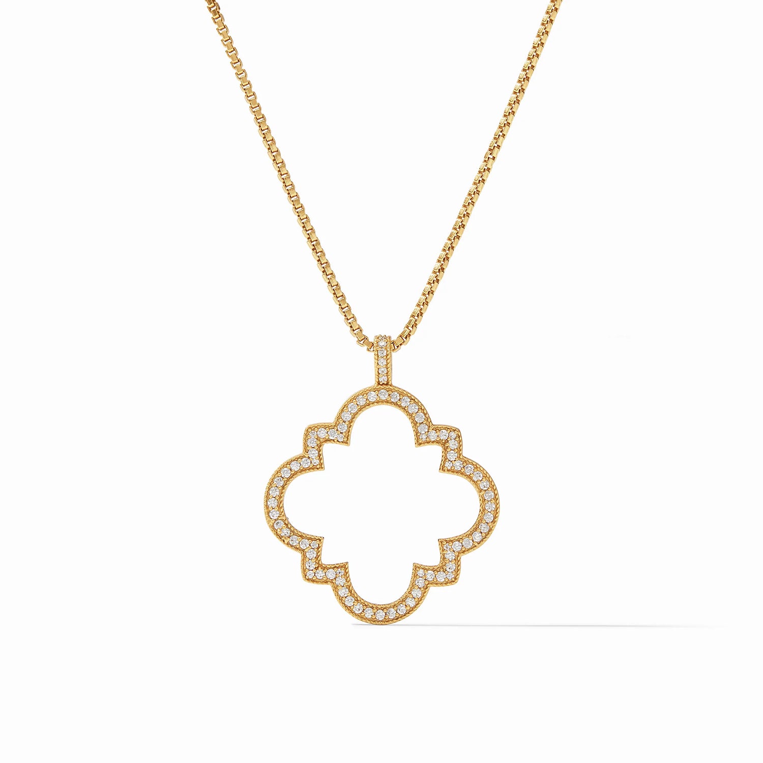 Discover the exquisite charm of the Julie Vos - Necklace - Odette Pendant, featuring a stunning pavé quatrefoil silhouette that sparkles beautifully on a lengthy box chain. Crafted from luxurious 24K gold plate and adorned with radiant cubic zirconia, this necklace is designed to be the centerpiece of your ensemble. With a versatile length of 35 inches, it can be worn long for a dramatic effect or doubled up to 18 inches for a chic layered look. The pendant measures 1.7 inches in total length, making it a striking addition to any jewelry collection. Adorned with the Julie Vos hallmark, this piece is a testament to quality and style.