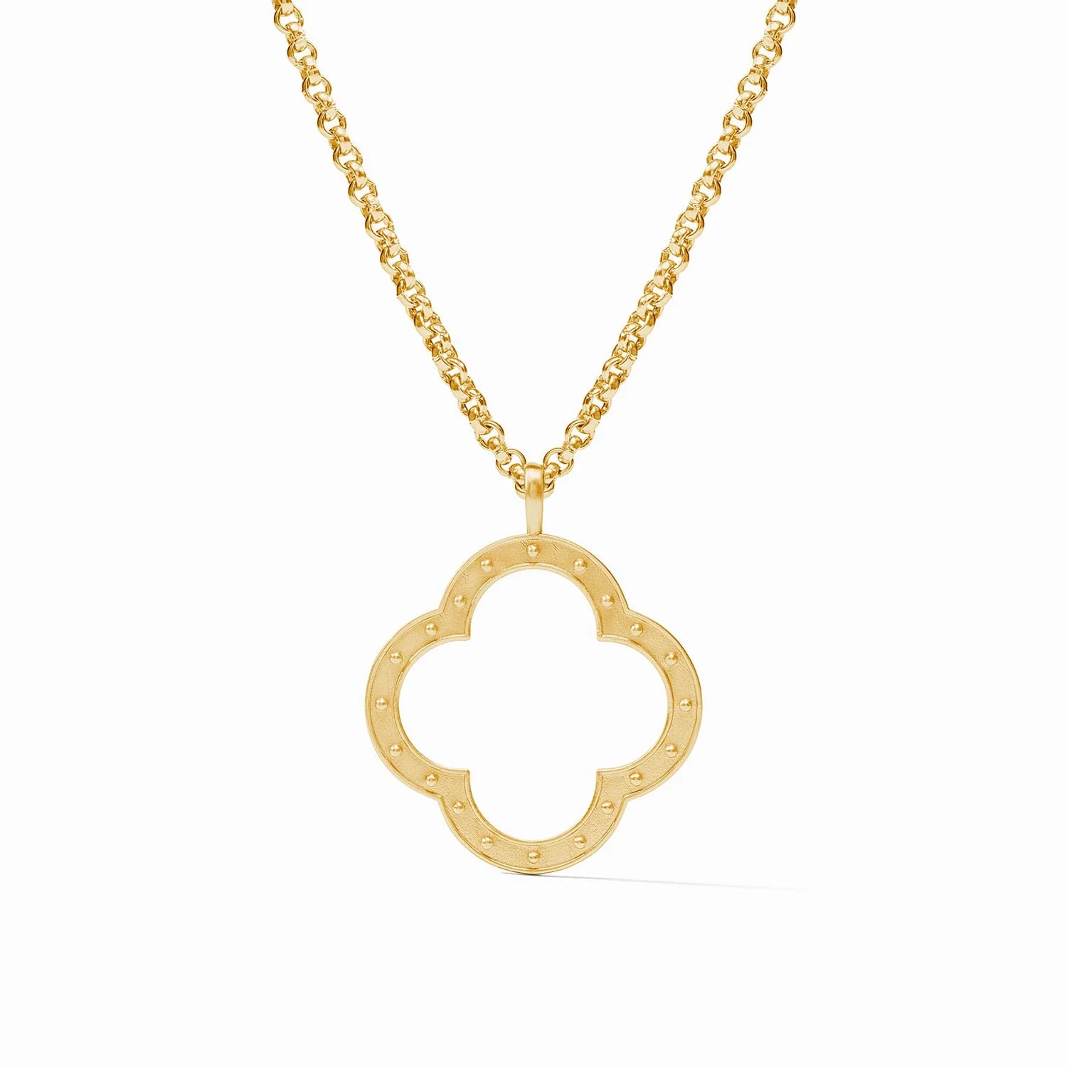 The Julie Vos - SoHo Reversible Statement Pendant features a stunning gold quatrefoil pendant adorned with a studded motif, inspired by the timeless cast-iron architecture of SoHo. Reverses to luxurious 24K gold plate. This exquisite piece hangs gracefully from a polished rolo chain, convertible in length from 36 inches or 18 inches when doubled for versatility. The pendant secures with a reliable spring clasp, ensuring both style and functionality. Adorned with the Julie Vos hallmark, this pendant is a perfect blend of elegance and modernity, making the Julie Vos - SoHo Reversible Statement Pendant an essential addition to any jewelry collection.