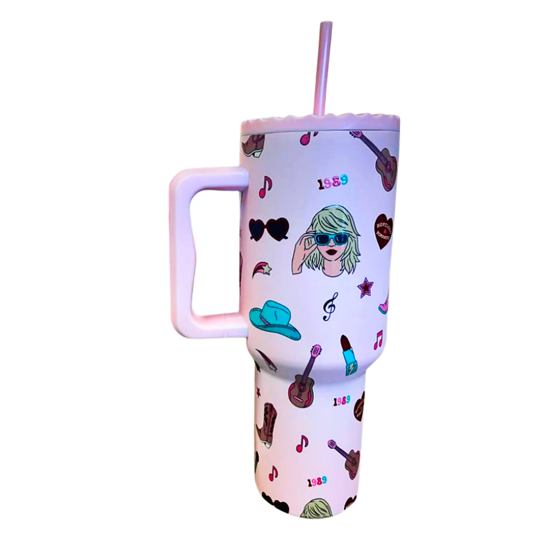 KatyDid - Swiftie Eras Icon Tumbler - 38oz is a must-have for every Taylor Swift fan. This stunning tumbler showcases a wraparound design featuring iconic symbols from each of Taylor's musical eras, from Fearless to Midnights, making it a perfect tribute to her artistry. Crafted with a durable stainless steel interior and double-wall insulation, this tumbler keeps your beverages hot or cold for hours, ensuring you enjoy your favorite drinks at the perfect temperature. The convenient side handle and screw-on lid with an additional top handle make it easy to carry, while the secure lid includes a straw opening with an adjustable cover to prevent spills. Designed to fit in most standard car cup holders, this tumbler is perfect for on-the-go lifestyles. Plus, it's dishwasher safe for effortless cleaning. Grab your KatyDid - Swiftie Eras Icon Tumbler - 38oz today and celebrate your love for Taylor Swift in style!