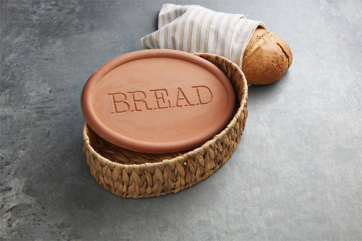 Description: 2-piece set. Water hyacinth basket holds oven-safe engraved terracotta stone.