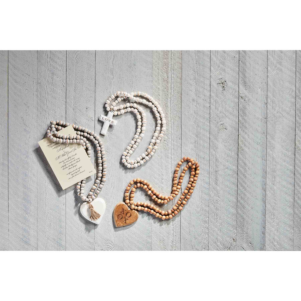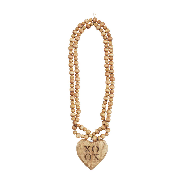 Add a little extra decor to any room with this Natural wood bead decor. The mango wood beads sit on a jute rope. The wood bead features an etched heart mango wood pendant. This wood bead decor is perfect to wrap around a vase, add to a coffee table or add to your dining table decor.