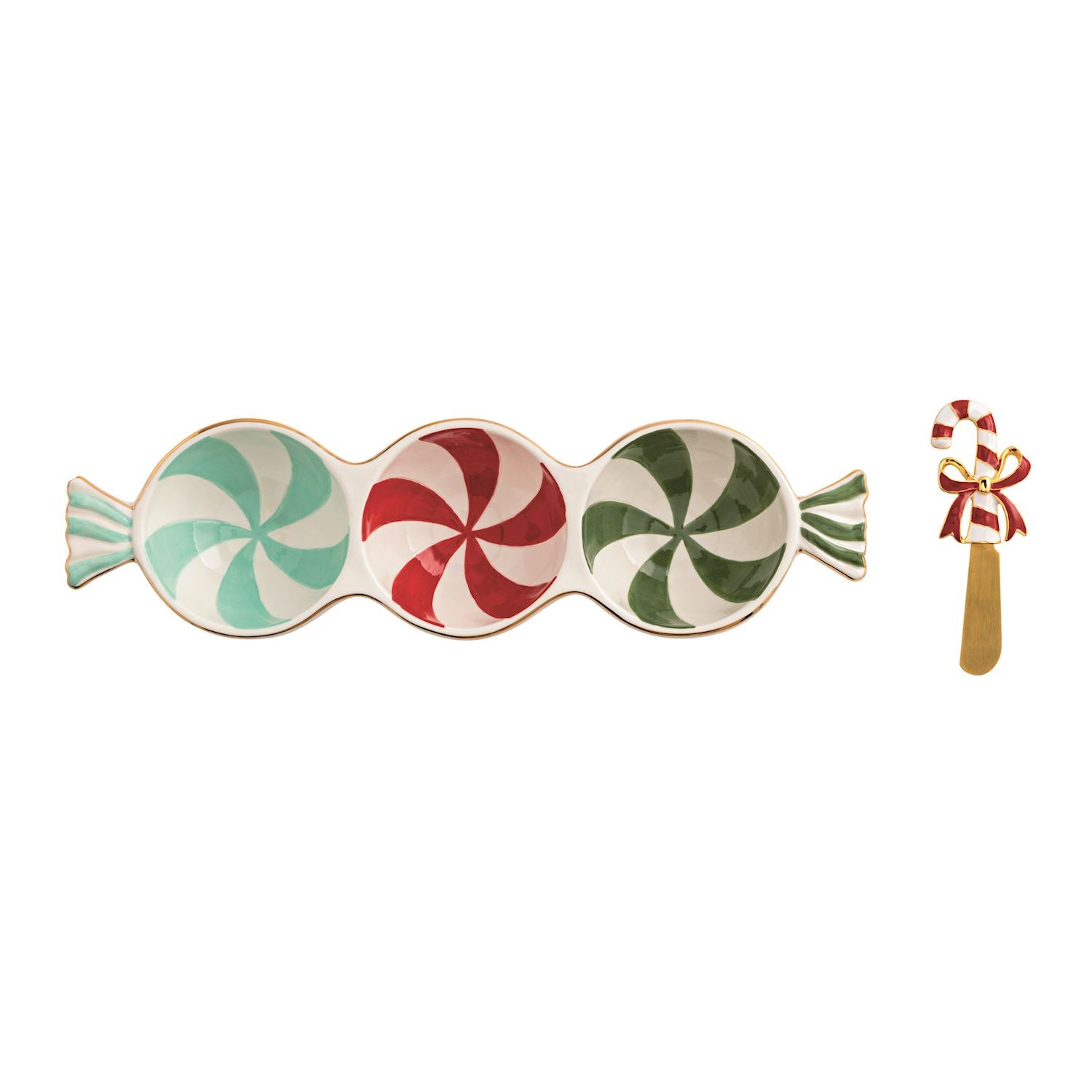 Add a festive touch to your holiday gatherings with the Mud Pie - Peppermint Triple Tidbit Set. This charming hand-painted ceramic triple tidbit dish features delightful candy cane designs, perfect for serving your favorite treats. Measuring 5 x 14 inches, it provides ample space for an assortment of snacks, while the included stainless steel spreader, adorned with an enamel-coated candy cane handle, adds a whimsical flair to your serving experience. Crafted from durable dolomite, this set is not only stylish but also practical for all your entertaining needs. Make your celebrations sweeter with the Mud Pie - Peppermint Triple Tidbit Set.