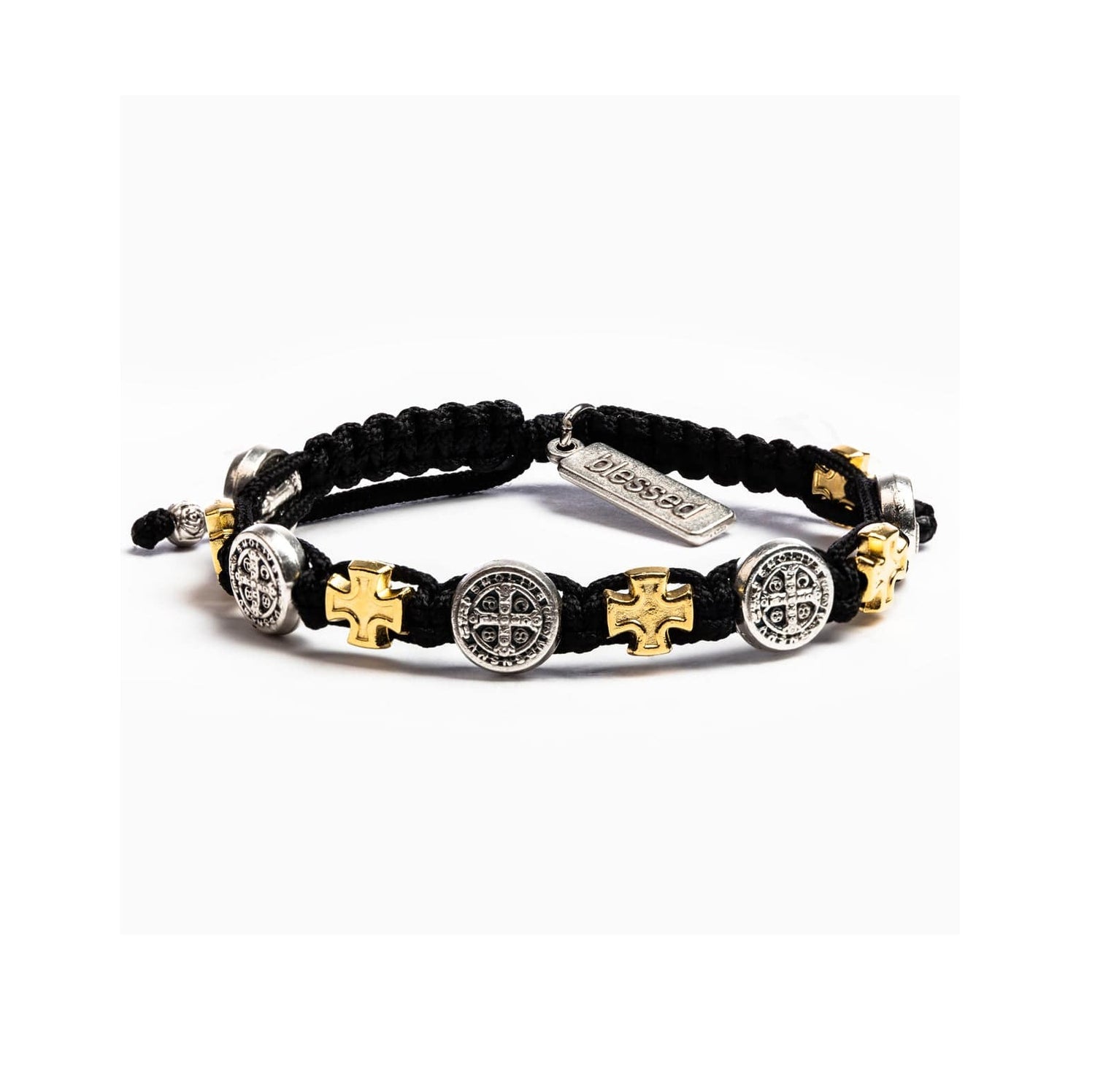 - 5 gold-tone cross medals and 5 silver-tone 1 cm Benedictine medals, silver-tone "blessed" tag