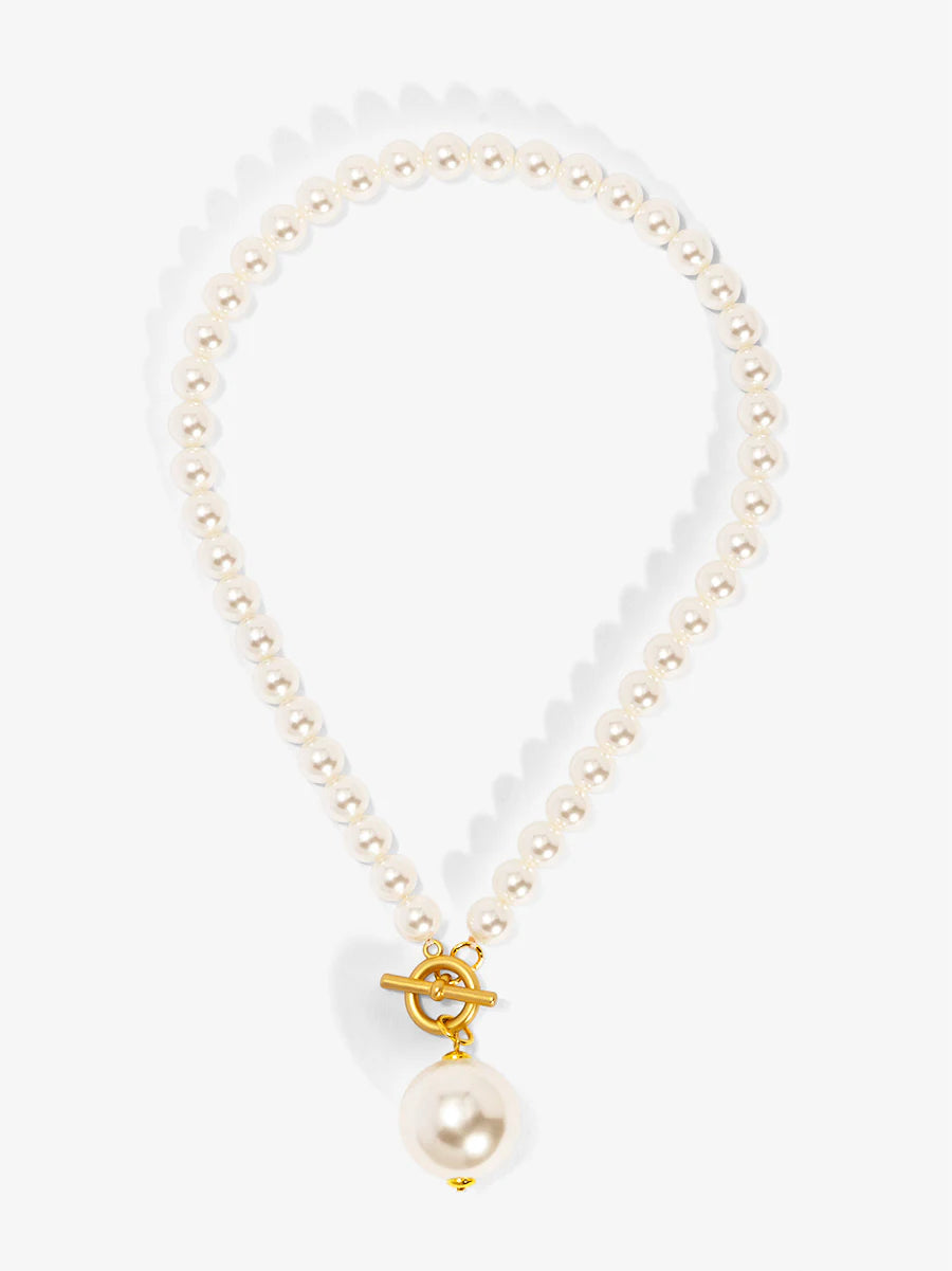 Discover the exquisite charm of the Necklace - Pearl Pendant Collar, a stunning accessory that combines elegance and sophistication. This collar necklace features a lustrous white pearl pendant, beautifully complemented by an 18K gold-plated toggle closure for a touch of luxury. With a length of 19 inches and a width of 8 inches, this piece is designed to make a statement, while the 1-inch drop adds a graceful touch. Crafted to be nickel and lead compliant, this necklace is hypoallergenic, ensuring comfort for all wearers. Perfect for any occasion, the Necklace - Pearl Pendant Collar is a must-have addition to your jewelry collection.