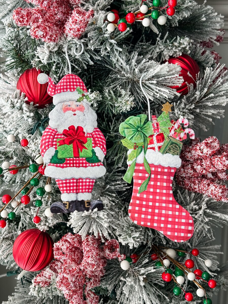 Add a touch of festive charm to your holiday decor with the Ornament - Gingham Santa or Gingham Stocking. Crafted in collaboration with The Round Top Collection, these delightful metal ornaments feature a whimsical Gingham Santa and a classic Gingham Stocking design, perfect for enhancing your Christmas tree or holiday display. Each ornament is designed to bring warmth and cheer to your celebrations, making them a wonderful addition to your seasonal decorations. Choose between the Gingham Santa or Gingham Stocking to personalize your festive ambiance.