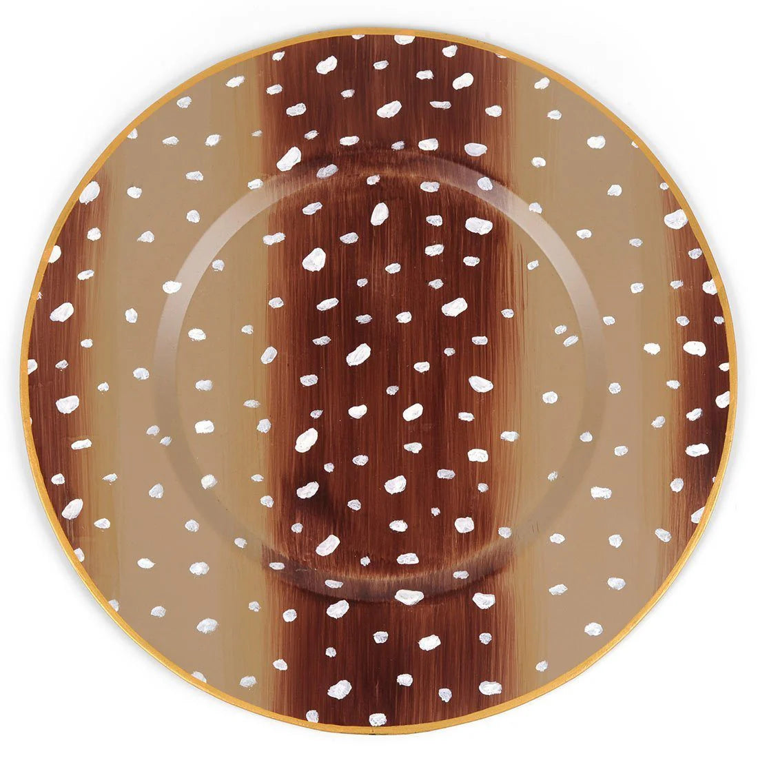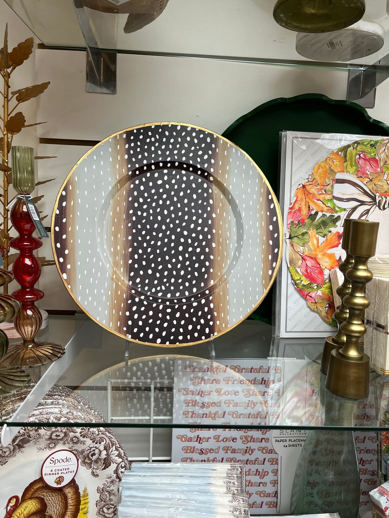 Enhance your dining experience with the Plate Charger - Antelope, a stunning 14-inch charger that features a unique design of white and brown spots. Coloring and markings may vary from piece to piece. Perfect for layering under your favorite plates, this charger adds a vibrant touch of color and pattern to your table setting, making it an ideal choice for Thanksgiving gatherings or any festive occasion. The Plate Charger - Antelope not only serves as a beautiful backdrop for your dishes but also brings life and character to your entertaining style. Make your table unforgettable with this exquisite piece. Like the pheasant napkin ring? Find it here!