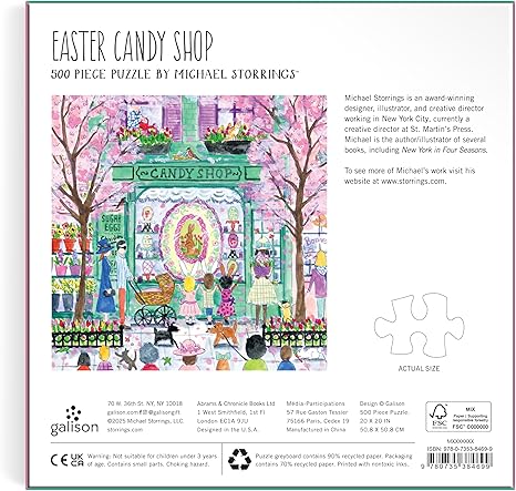Experience the joy of assembling the Puzzle - Galison Easter Candy Shop, a delightful 500-piece jigsaw puzzle featuring the charming artwork of Michael Storrings. This captivating puzzle showcases a vibrant Easter candy shop, bringing to life the festive spirit of the season. The bold and colorful imagery not only provides an enjoyable challenge but also transforms into a stunning piece of art once completed, perfect for display. Crafted from premium materials, each piece is thick and sturdy, ensuring durability and a satisfying fit. Measuring 20 inches by 20 inches when finished, this puzzle is designed for both individual relaxation and family bonding, making it an ideal gift for anyone seeking a creative escape from daily routines. With a commitment to sustainability, the puzzle is made from 90% recycled paper, and the packaging consists of 70% recycled materials, all printed with nontoxic inks. Enjoy countless hours of fun with the Puzzle - Galison Easter Candy Shop, where creativity meets quality.