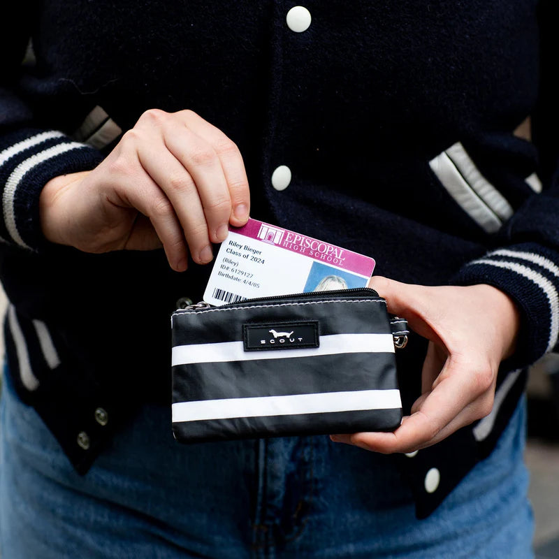 The Scout - IDKase - As If is the perfect solution for those who prefer a compact and secure way to carry their essentials. Weavie Nicks pattern showcases a modern geometric blue background with greens and oranges. This slim card holder, designed for easy access, features a key clasp that allows for convenient attachment to backpacks, keychains, or lanyards. Made from water-resistant coated cotton, it ensures effortless cleaning while protecting your items. The clear plastic window not only safeguards your ID but also displays it prominently. Measuring 5W x 3.25H x 0.5D, the Scout - IDKase - As If is ideal for anyone looking to streamline their carry options without sacrificing style or functionality.