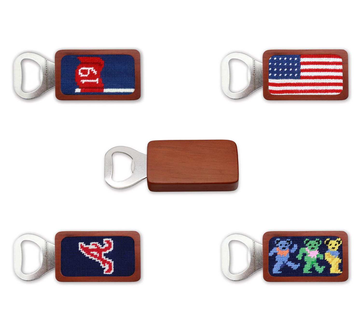 Discover the perfect blend of craftsmanship and functionality with the Smathers & Branson - Wooden Bottle Opener. This exquisite bottle opener features 100% hand-stitched needlepoint crafted with premium French cotton thread, elegantly inlaid into a solid chestnut-colored wooden handle. Measuring 4.25 inches long, 1.75 inches wide, and 0.5 inches thick, it not only serves as a practical tool for opening your favorite beverages but also adds a touch of sophistication to your kitchen or bar. With a hidden magnet, you can easily attach it to your fridge for convenient access or display it proudly on your countertop. Enhance your entertaining experience with the Smathers & Branson - Wooden Bottle Opener, a must-have for any home.
