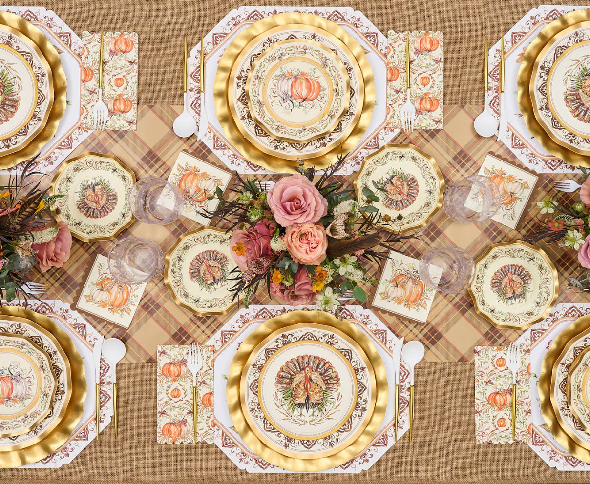 Sophistiplate - Wavy Edge Dinner Plate - Turkey & Gourds is the ideal choice for your Thanksgiving table or any fall celebration. These exquisite 10.5-inch round plates feature shimmering gold foil wavy edges and a beautifully illustrated turkey at the center, adding a festive charm to your dining experience. Crafted from durable paper, these plates are both stylish and disposable, allowing you to enjoy your meal without the hassle of washing dishes. Your guests will be amazed at the quality and elegance of these plates, making them a perfect addition to your holiday gatherings. Sophistiplate - Wavy Edge Dinner Plate - Turkey & Gourds comes in a pack of 8, ensuring you have enough for all your loved ones.