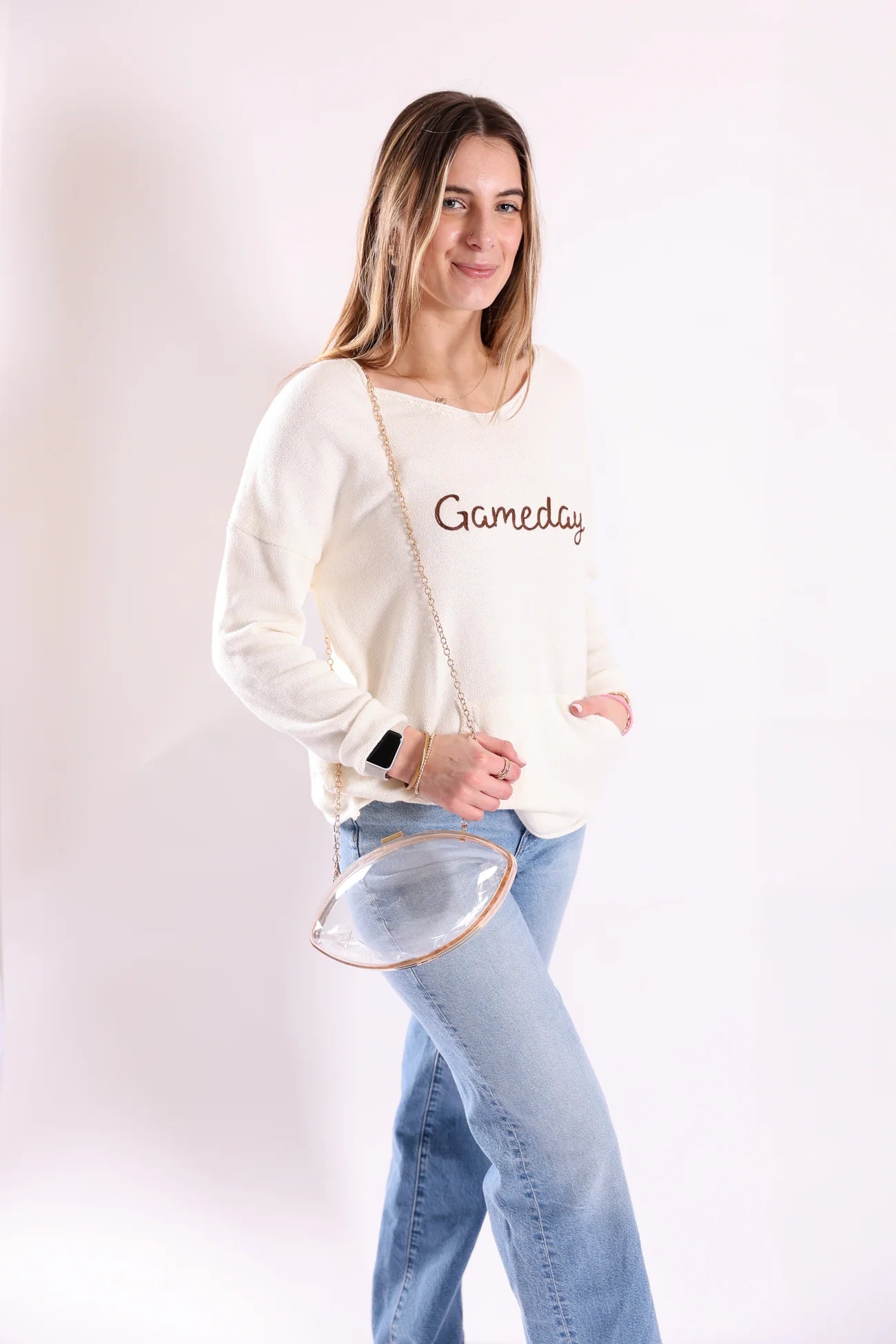 Score big on style and convenience with our Stadium Bag - Clear Football-Shaped. This chic and playful bag is stadium-approved, making it the perfect accessory for football games, tailgates, and weekend outings. Designed with a gold chain strap, it features a hinge opening and push-lock closure to keep your essentials secure while showcasing your team spirit. Measuring 9.5 inches in length, 5 inches in height, and 5.5 inches in depth, with a 16.5-inch circumference, this bag comes with two removable gold chain straps: a shoulder strap with a 24-inch drop and a handbag strap with a 6.25-inch drop. Make a statement while staying compliant with stadium regulations with the Stadium Bag - Clear Football-Shaped.