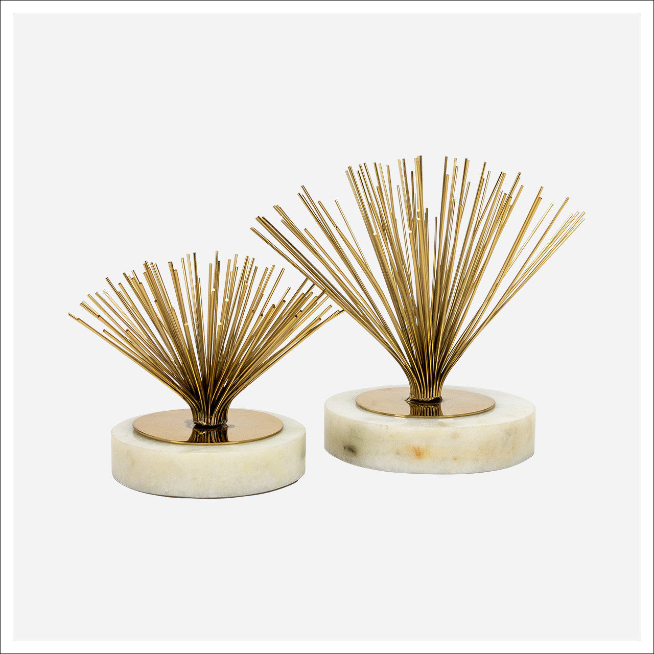 Transform your living space with the stunning Starburst Sculpture, a perfect blend of modern glamour and artistic expression. This set of two decorative pieces features a striking design of slender rods radiating from a sturdy base, creating a captivating starburst effect that draws the eye. Standing at 9 inches tall and with a diameter of 10.5 inches, these sculptures are versatile enough to serve as coffee table centerpieces, mantel accents, or bookshelf art. The luxurious metallic gold finish beautifully reflects light, adding depth and sophistication to any decor style, from modern and transitional to glam and coastal. The organic sea urchin-inspired silhouette enhances its appeal, making it a perfect fit for various design themes. Each piece can be showcased individually or together, offering endless styling possibilities for console tables, dining areas, or office spaces. The bold geometric design and refined metalwork make the Starburst Sculpture not just a decorative item, but a conversation starter that elevates your home decor.