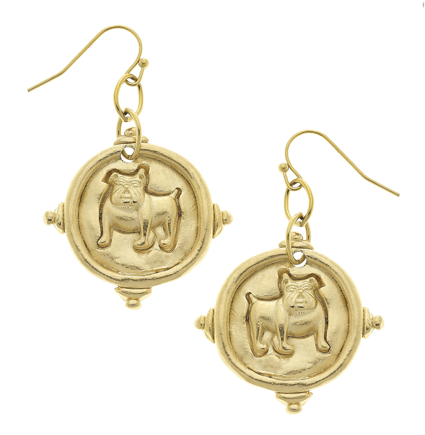 These Susan Shaw - Bulldog Gold Drop Earrings feature a charming bulldog design, making them a perfect accessory for any dog lover or UGA DAWG lover. The earrings measure 2" in length and 1" in width, and they showcase the iconic UGA bulldog drop earring style. Crafted with attention to detail, these earrings are not only stylish but also a great way to show your love for bulldogs. Add a touch of elegance and personality to your outfit with these gold bulldog earrings.