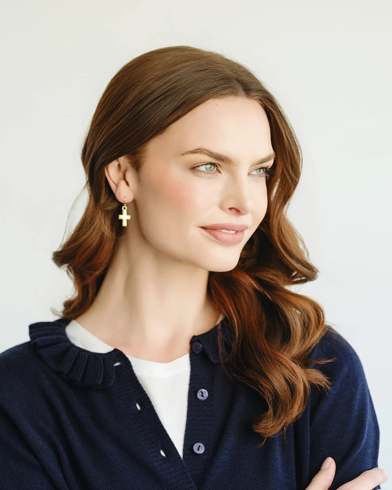 Discover the elegance of the Susan Shaw - Earring - Cross 24k Gold - Small, where modern design meets timeless symbolism. These lightweight earrings feature a delicate cross measuring .75 inches, offering subtle movement that beautifully frames your face. Crafted with care, each piece is triple-plated in luxurious 24K gold and handmade in the USA, ensuring quality and uniqueness. Perfect as a thoughtful gift or a stunning addition to your own jewelry collection, these earrings are a must-have for any occasion.
