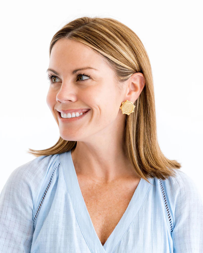 Experience elegance with the Susan Shaw - Earring - Queen Elizabeth II Coin Studs, featuring two exquisite gold coin stud earrings that pay tribute to the remarkable Queen Elizabeth II. Each earring, with a 1 inch diameter, is triple plated in 24K gold, showcasing a stunning portrait of Her Majesty adorned with the diamond diadem. Handmade in San Antonio, TX, these earrings serve as a lasting memory of a queen who dedicated 70 years to service, embodying strength, grace, and faith. To maintain their beauty, simply clean with a dry, clean cloth and avoid wearing them while swimming or showering. Elevate your jewelry collection with the Susan Shaw - Earring - Queen Elizabeth II Coin Studs, a perfect blend of history and craftsmanship.