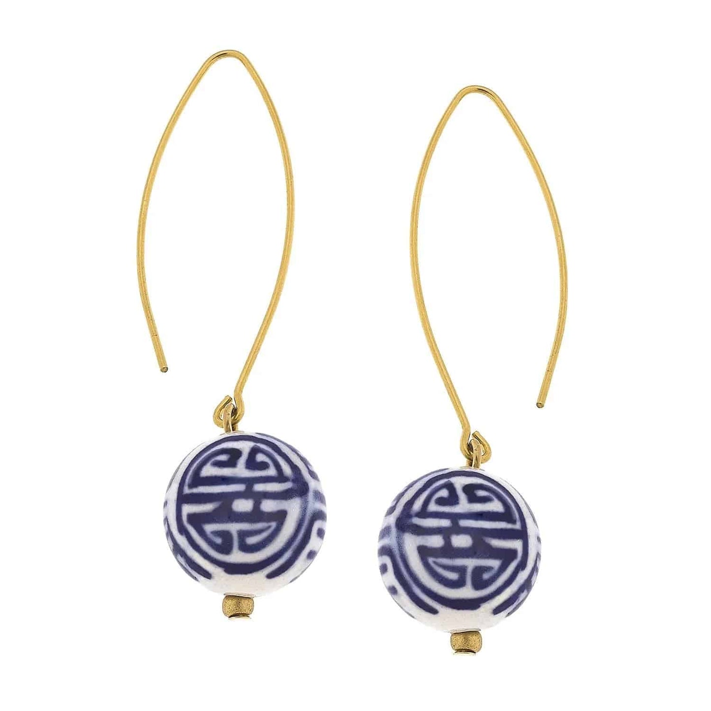 **Artful Detail:** A hand-painted porcelain bead delicately floats at the base, adding a touch of artistry to these exquisite earrings. The blue and white color palette enhances the timeless appeal, making them a versatile accessory for any occasion.