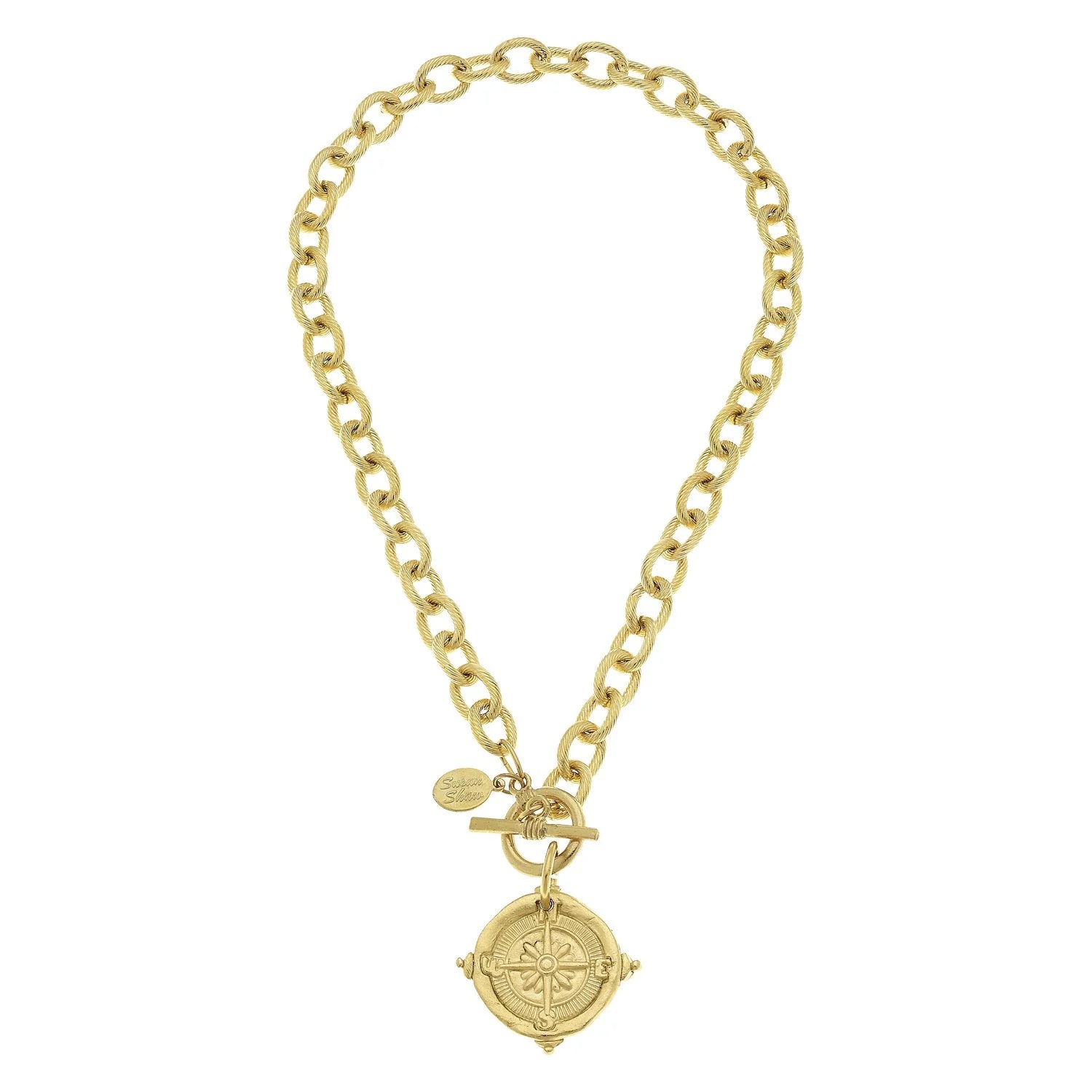 Discover the exquisite charm of the Susan Shaw - Necklace - Compass Toggle, a stunning piece that features a beautifully crafted compass rose intaglio charm, perfect for those who appreciate nautical elegance. This best-selling necklace is designed with a secure toggle clasp and is available in a versatile 16 inch chain, making it an ideal accessory for any outfit. Crafted with care in San Antonio, Texas, this necklace is triple-plated in 24k gold, ensuring a luxurious finish that will last. Our collections are thoughtfully designed to be worn together or mixed and matched, allowing you to create a unique look that reflects your personal style. To maintain the beauty of your jewelry, simply clean it with a dry cloth and store it in the complimentary keepsake pouch provided. Shop the Susan Shaw - Necklace - Compass Toggle today and add a touch of sophistication to your jewelry collection.
