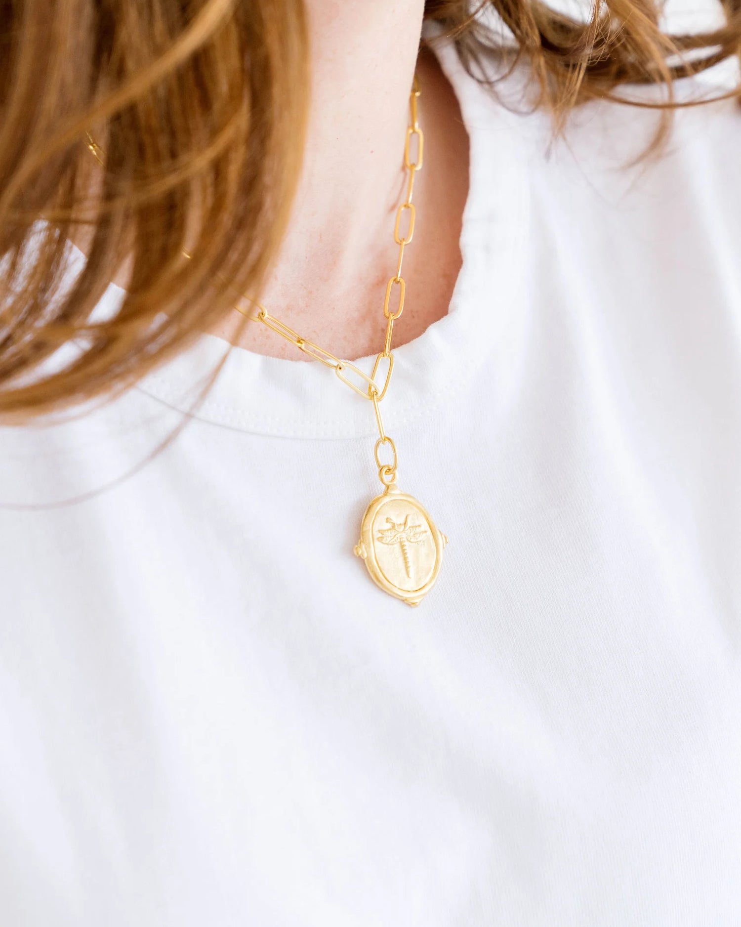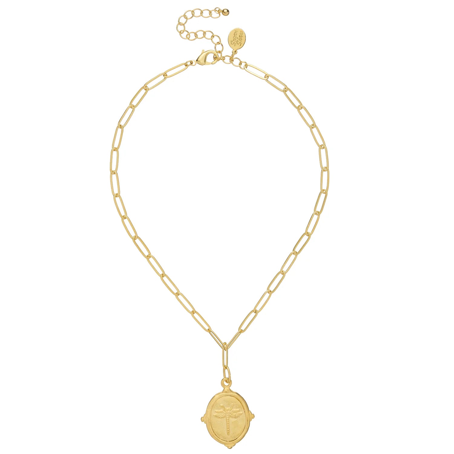 Discover the enchanting beauty of transformation with the Susan Shaw - Necklace - Dragonfly Paperclip. This exquisite piece, inspired by the timeless symbolism of the dragonfly, serves as a delicate reminder of life's seasons and the enlightening perspectives they bring. Crafted with care in San Antonio, Texas, this necklace features a stunning triple-plated 24k gold finish, ensuring a radiant shine that lasts. With a length of 16 inches and a 3-inch extender, it offers versatility for any occasion, while the 1.4 inch x 1 inch pendant adds a unique touch to your jewelry collection. Embrace the potential of your future with the Susan Shaw - Necklace - Dragonfly Paperclip, a perfect blend of elegance and meaning.