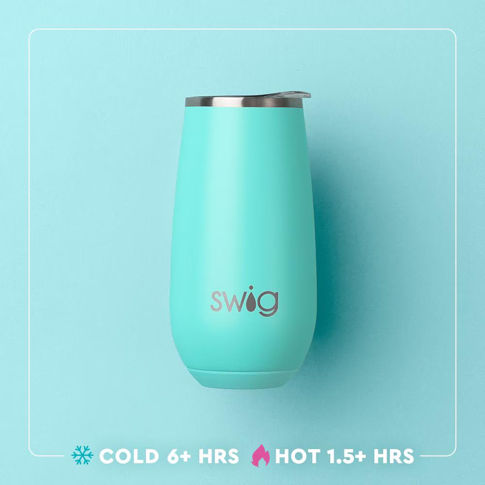 Celebrate every moment with the Swig - Stemless Flute 6oz - Bubbly, designed to keep your favorite sparkling beverages chilled for hours. Featuring a festive pattern of metallic gold prosecco and champagne bottles on a crisp white background, this insulated flute is perfect for toasting at any occasion. With a capacity of 6oz, it maintains your drinks cold for over 6 hours and hot for 1.5 hours, thanks to its double-walled, vacuum-sealed, and copper-plated construction. Made from durable 304-18/8 stainless steel, it is condensation-free and non-breakable, ensuring a mess-free experience. The built-in silicone coaster base prevents slips, drips, and scratches, while the included X-Small EZ Flow Lid adds convenience. Measuring 5 inches in height and 2.3 inches in width, with a base diameter of 1.9 inches, this flute is a delightful gift for any celebration. Please note that all prints are hand applied, resulting in slight variations.
