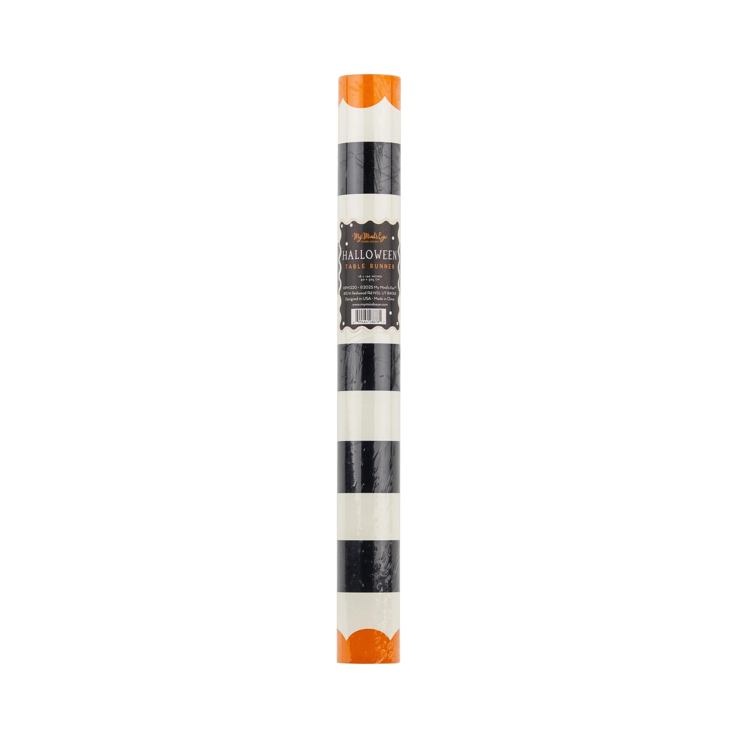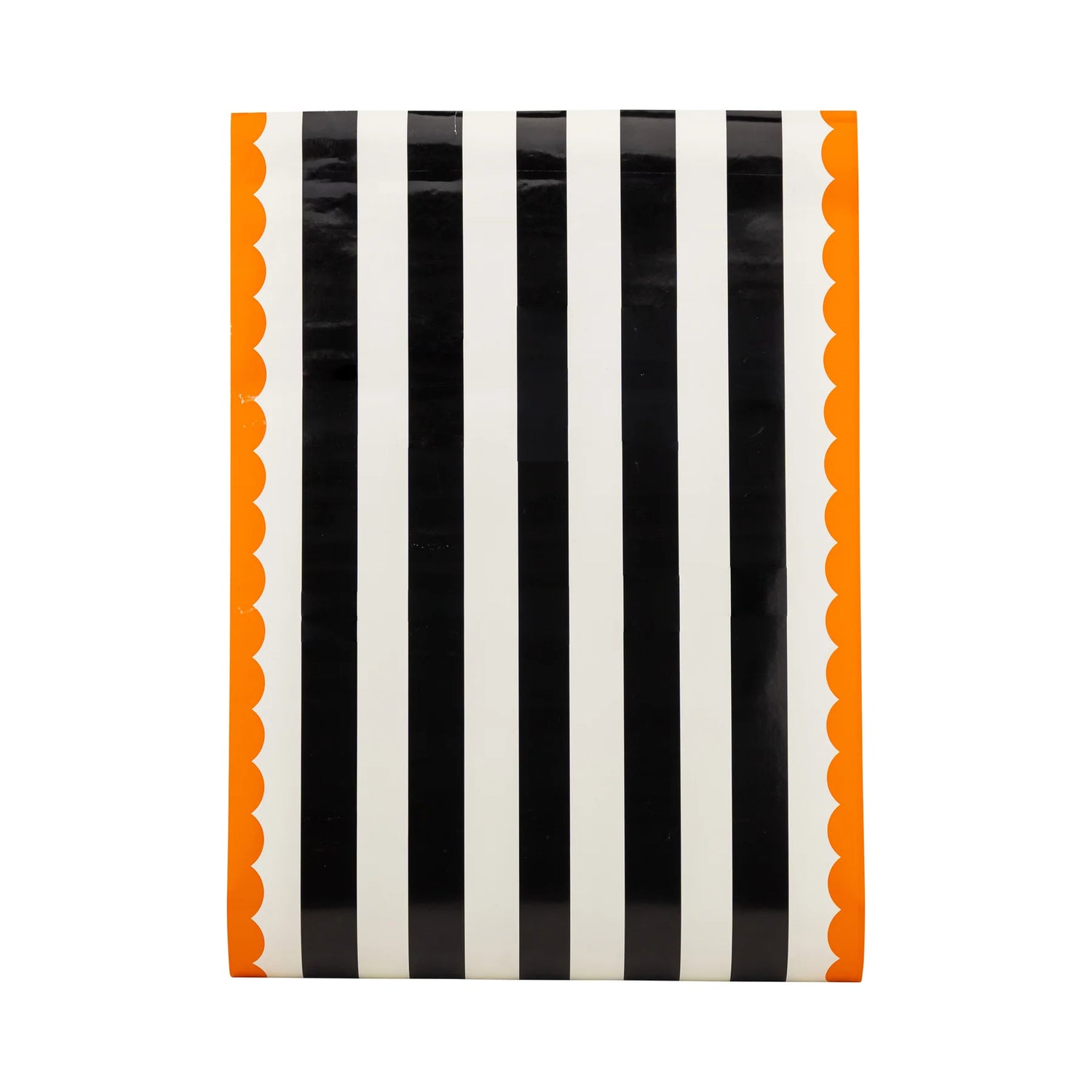 Transform your Halloween party table with the striking Table Runner - Black White Stripes Orange Border. Measuring 16 x 120 inch, this paper table runner adds an instant touch of spooky style to your buffet, dining table, or dessert station. The bold black and white stripes, complemented by a vibrant orange border, create a fun and playful backdrop for all your Halloween treats and decorations, making it a must-have accessory for your festive gathering. Make your Halloween celebration unforgettable with the Table Runner - Black White Stripes Orange Border.