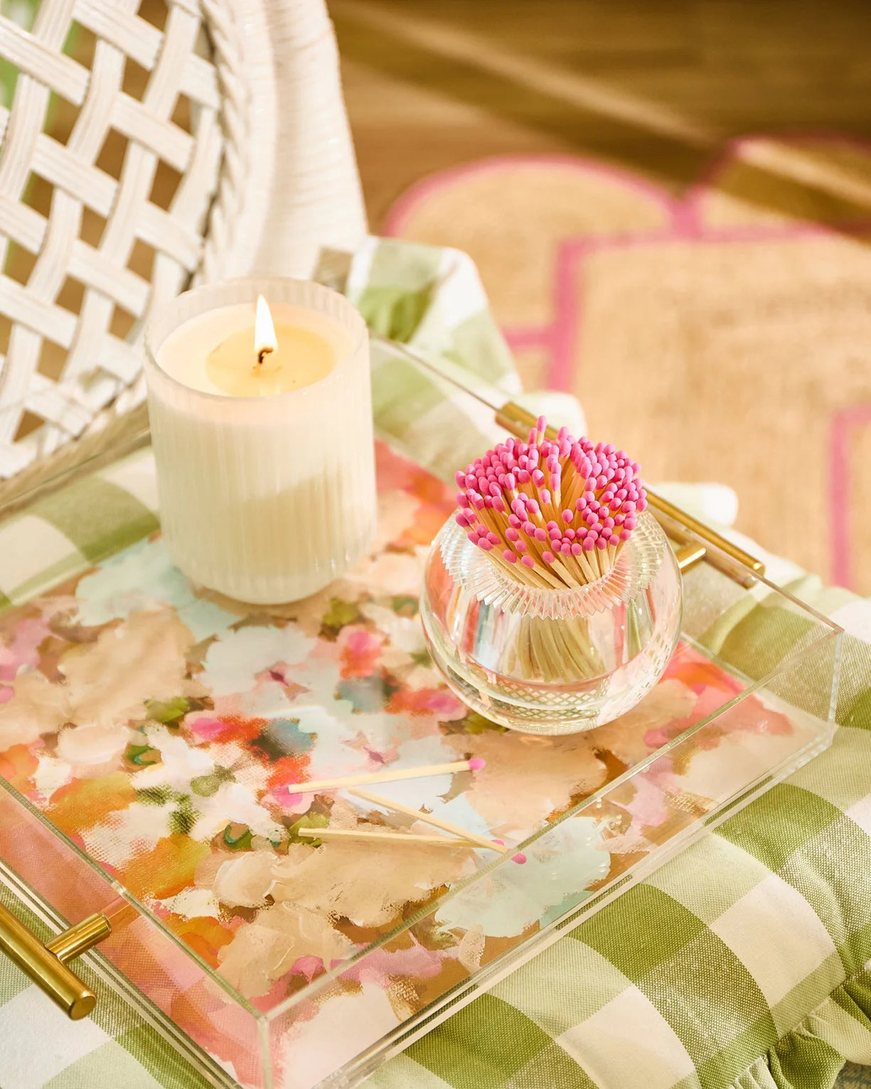 Add a touch of style to your space with the Tart by Taylor - Match Striker - Hot Pink Matches. This chic acrylic match striker is designed to be the perfect accessory for your coffee table, desk, or any area that could use a pop of flair. Measuring 3.5 inches in diameter and 3 inches high, it features a convenient strike pad on the bottom for easy igniting of the included 140 matches. Whether you're lighting candles or starting a cozy fire, this match striker keeps everything you need within reach. Plus, it's easy to maintain—simply wipe clean with a damp cloth. The Tart by Taylor - Match Striker - Hot Pink Matches is sold individually, making it a unique addition to your home decor.