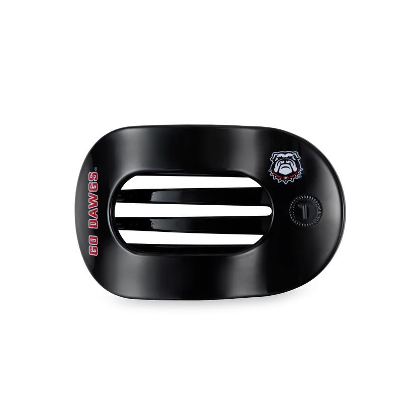 Lay flat and relax with the new Teleties - Go Dawgs! Medium Flat Round Hair Clip in Black and Red. This hair clip is designed to allow you to lay back flat, do yoga, or sit comfortably in a seat with a headrest, and it is made with the same material that is nearly unbreakable. Shop your favorite University of Georgia hair accessories now! Go Dawgs!