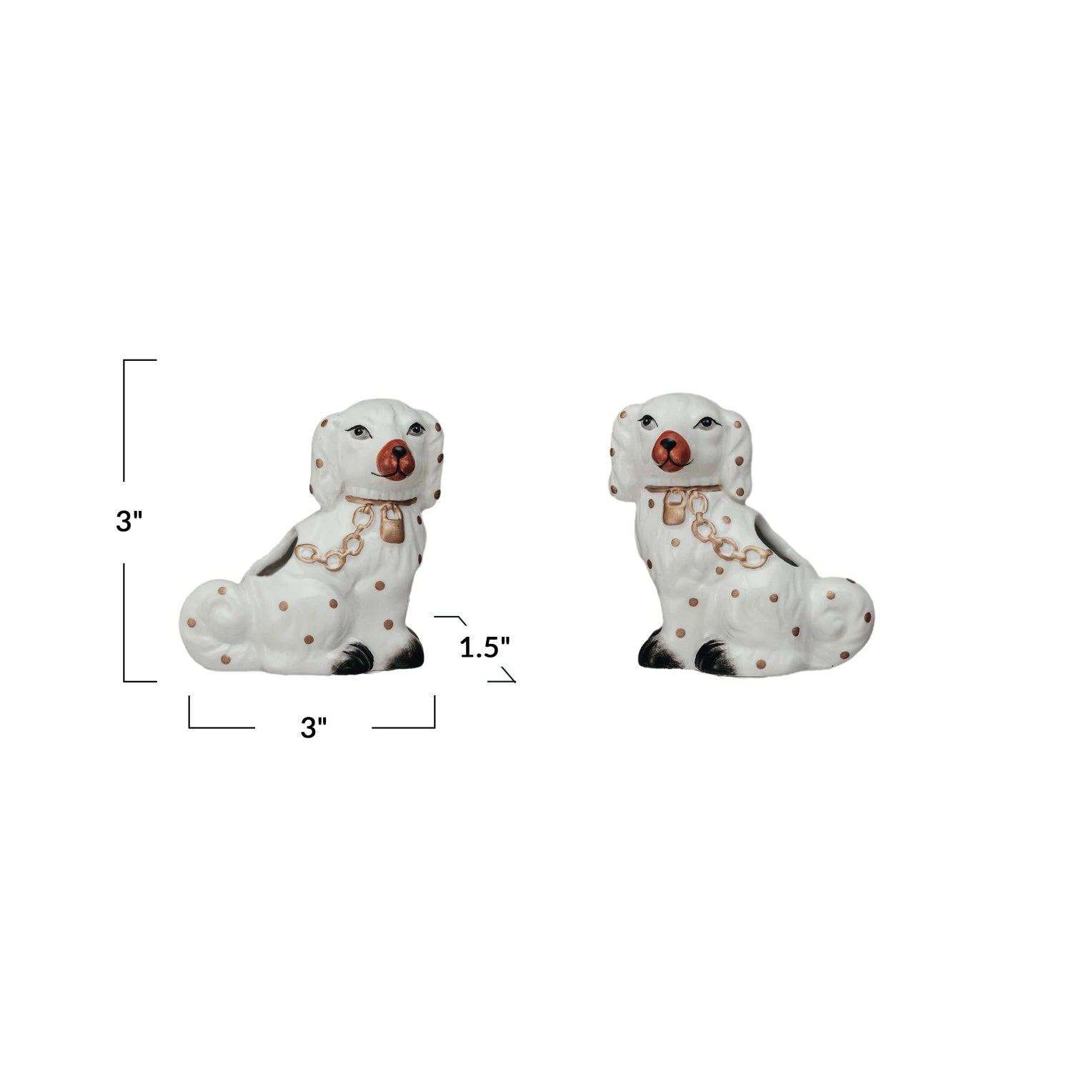 This charming Ceramic Staffordshire Dog Shaped Toothpick Holder measures 3L x 1-1/2W x 3H inches and features exquisite gold electroplating. Available in two delightful styles, the dog faces can be oriented either left or right. The style will be chosen randomly. This Toothpick Holder - Staffordshire Dog not only serves a practical purpose but also adds a whimsical accent to your home decor. Perfect for dog lovers, this decorative piece is an ideal addition to any dining table or kitchen counter. Enhance your collection with this delightful Toothpick Holder - Staffordshire Dog.
