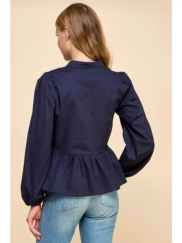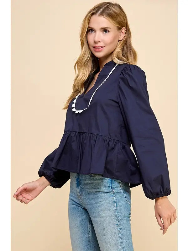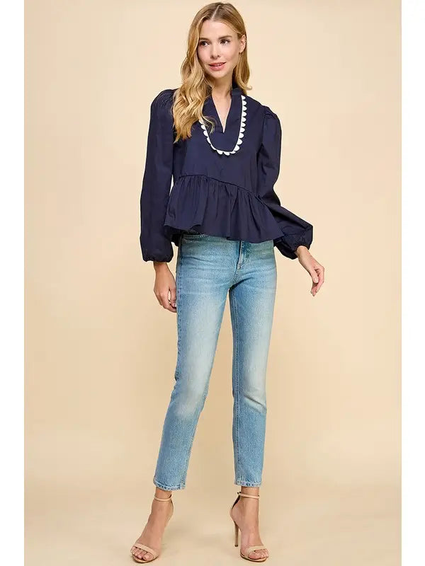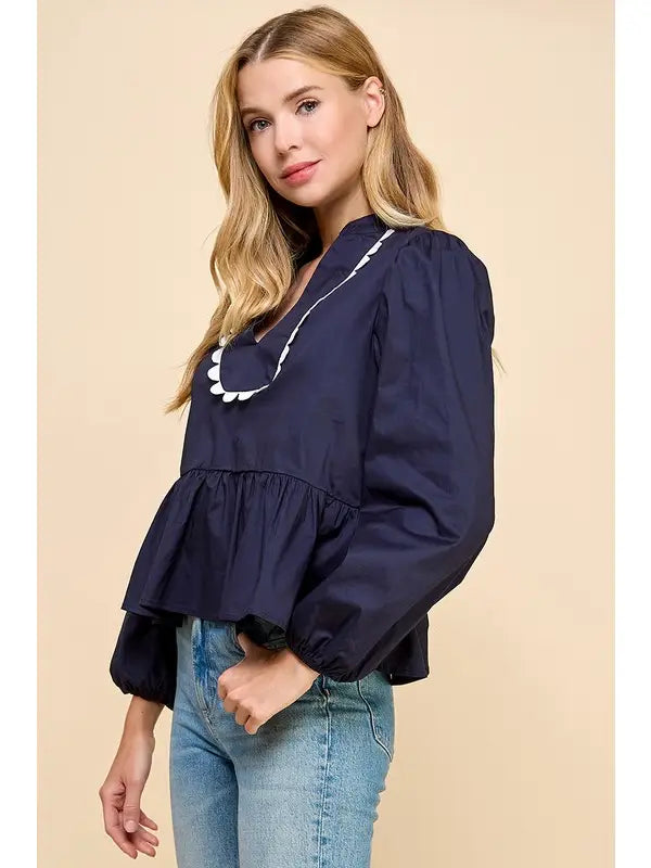 This navy blouse with white scallop trim is a great option for a casual or a festive look. The Top - Long Sleeve Scallop Border - Navy features a split V-neckline, long puff sleeves, and a ruffle hem, with a scalloped detail on the neckline. Made from 100% cotton, this top should be dry cleaned only. The model is 5'9" tall, wears a size small.This Top - Long Sleeve Scallop Border - Navy is a versatile and stylish addition to any wardrobe, perfect for creating a chic and relaxed outfit.